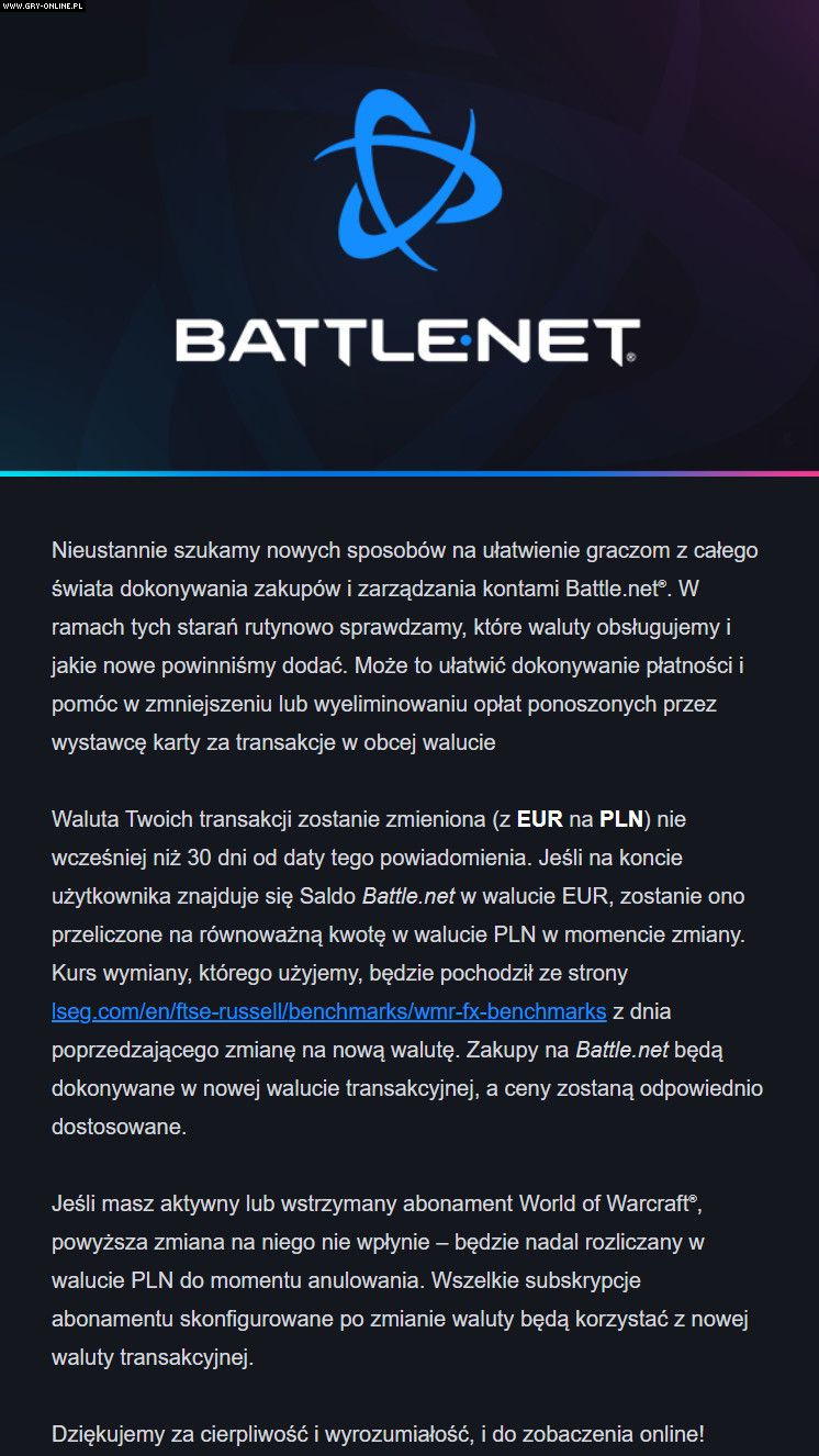 Wygląda na to, że polscy gracze wkrótce zapłacą w całym Battle.net rodzimą walutą. Użytkownicy platformy zaczęli otrzymywać e-maile z informacją o planowanej zmianie z euro na złotówki – „nie wcześniej niż 30 dni od daty tego powiadomienia”. Innymi słowy, ceny w PLN powinny się pojawić po 22 lutego.