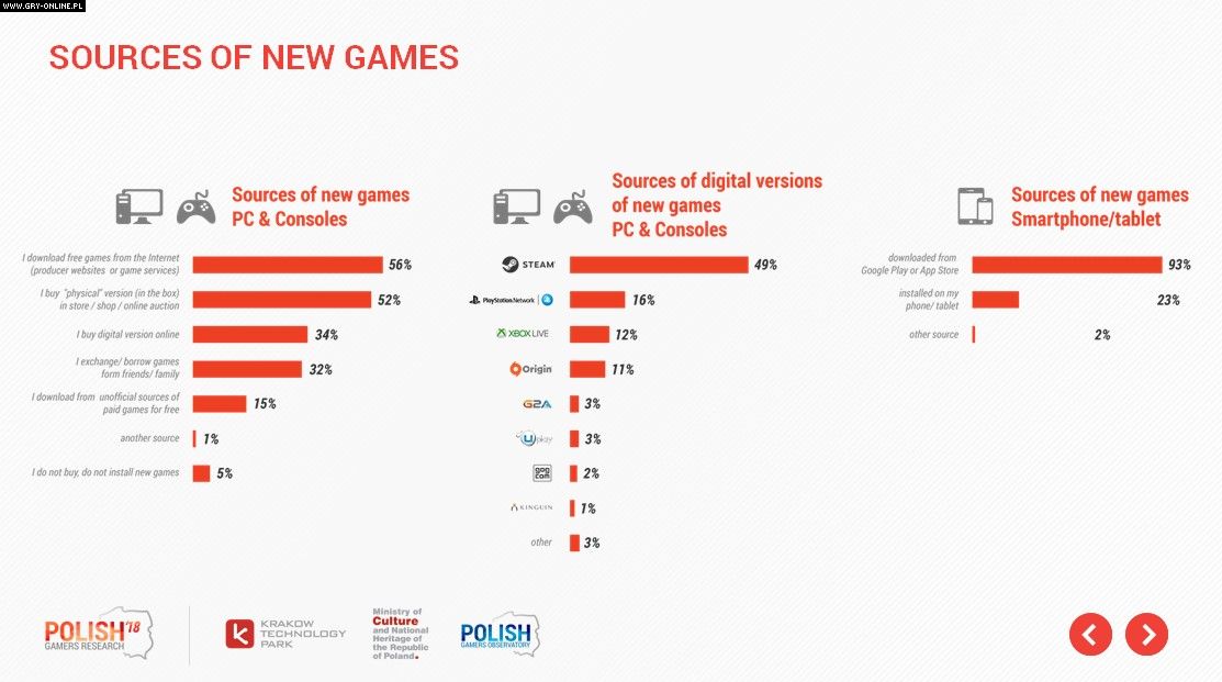 Jeśli chodzi o wirtualne zakupy, to Valve zgarnia lwią część tortu. Z najpopularniejszej na świecie platformy dla PC korzysta bowiem 49% badanych. Dwa kolejne miejsca w peletonie należą do wewnętrznych sklepów konsolowych Sony (16%) i Microsoftu (12%), a Origin od Electronic Arts zachęca do siebie jedynie 11% z graczy (sam zakup cyfrowy, bo tytuły oczywiście wymagają przypisania do konta przez internet). Uplay należący do francuskiego Ubisoftu nie wydaje się być darzony zbyt dużym zaufaniem, podobnie jak rodzime GOG.com (czyżby produkcje retro nie cieszyły się nad Wisłą zbyt dużym wzięciem?). „Sklepy z kluczami”, czyli G2A i Kinguin także wydają się niszowe.