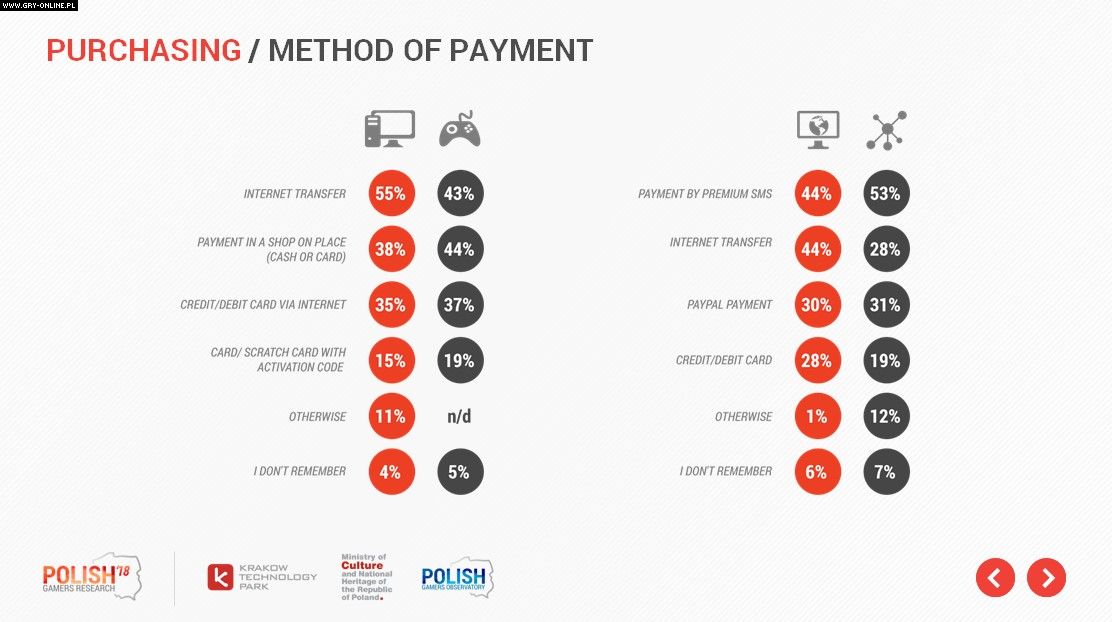 Kiedy jesteśmy już zdecydowani, gra znajduje się w wirtualnym czy też całkiem prawdziwym koszyku, to pozostaje nam jedynie sfinalizowanie transakcji. Wśród konsolowców i pecetowców najpopularniejszy jest przelew przez Internet (odpowiednio 55% i 43%). W tym przedziale mieszczą się zapewne wszystkie aukcje, internetowe sklepy stacjonarnych sieci itp. Zwolennicy padów nieco częściej kupują kartą czy gotówką w sklepie (44% vs 28% dla pecetów). Wpisywanie numerów karty debetowej lub kredytowej jest wygodne dla nieco powyżej 30% obydwu grup graczy, a spora ich liczba nadal korzysta ze zdrapek z kodem.