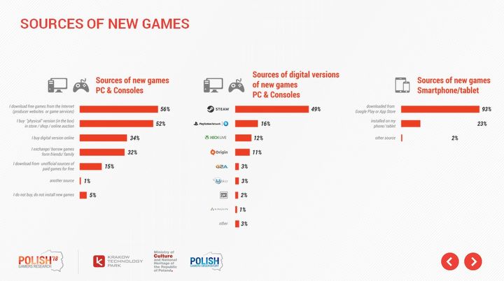 Metod zaopatrywania się w świeże produkcje mamy bez liku, choć w naszym kraju światowe trendy nie są jeszcze aż tak wyraźne. Najpopularniejszym sposobem rozszerzania swojej biblioteki tytułów na PC i konsolach – do którego przyznaje się 56% respondentów – jest nieodpłatne ściąganie ich ze strony producenta lub platformy cyfrowej dystrybucji. W tym worku znajdują się zarówno produkcje F2P, jak i akcje promocyjne, podczas których gry rozdawane są za darmo (często piszemy o tego typu wydarzeniach na łamach naszego newsroomu). Natomiast nieco ponad połowa badanych nadal zaopatruje się w nowości w pudełkach.