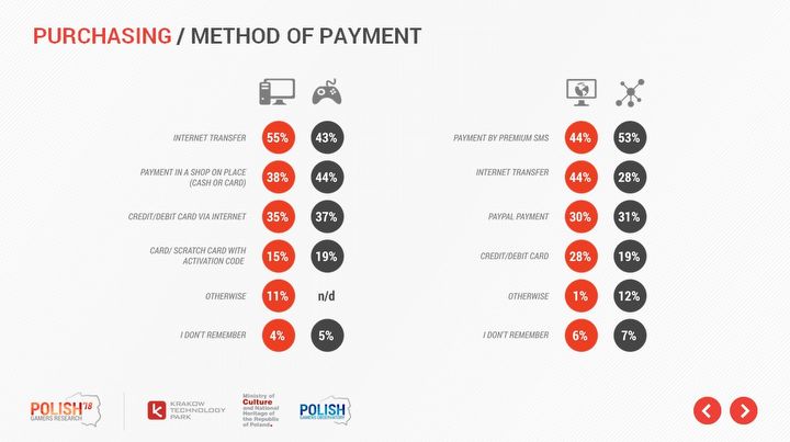 Na platformach społecznościowych i w grach przeglądarkowych złotym standardem jest znany od lat premium SMS, wysoko są także przelewy, a około jedna trzecia graczy wykorzystuje transfery PayPal i karty kredytowe. Warto zwrócić uwagę, jak duża przepaść widoczna jest między SMS-ami a innymi metodami zapłaty w przypadku serwisów społecznościowych (53%, a potem już 28%).