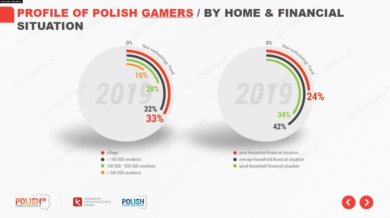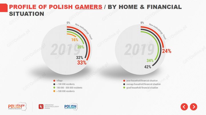 Mieszkamy w miejscowościach o wszelkim możliwym rozmiarze, choć najczęściej na wsi (33%) lub w miasteczku do 100 tys. mieszkańców (32%), co de facto mówi więcej na temat charakterystyki polskiego społeczeństwa niż graczy jako takich. Można jednak zauważyć, że w porównaniu z poprzednimi edycjami badania, w 2019 roku zwiększył się odsetek graczy mieszkających w dużych miastach. Znakomita większość graczy (50%) posiada stałą pracę i deklaruje, że znajduje się w przeciętnej (42%) lub dobrej (34%) sytuacji finansowej.