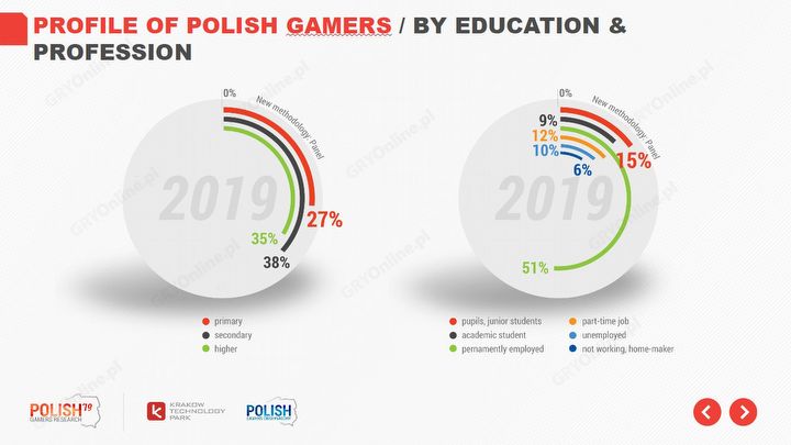 Ciekawie prezentują się dane na temat wykształcenia – wynika z nich, że w gruncie rzeczy nie ma ono wielkiego znaczenia w kontekście naszego hobby. Najliczniejszą grupą w polskiej społeczności graczy są ludzie po szkole średniej (38%), ale nie brakuje także absolwentów szkół wyższych (35%) oraz Polaków, którzy na razie ukończyli tylko szkołę podstawową (zapewne niejednokrotnie jest to związane z wiekiem – najmłodsi z badanych to nastolatkowie).