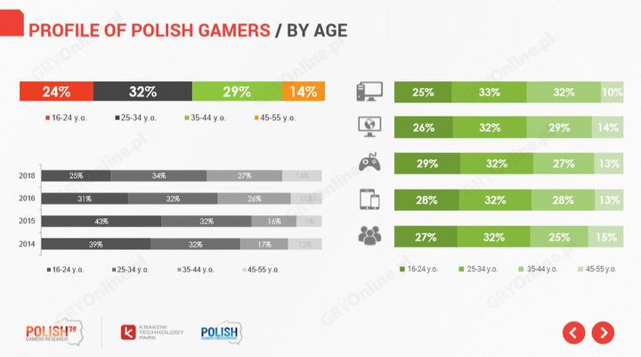 Analizując wiek musimy mieć na uwadze, że wszystkie dotychczasowe edycje Polish Gamers Research były realizowane na próbie wiekowej 15-55 lat. Większość polskich graczy mieści się w przedziale 25-34 (32%) lub 35-44 lata (29%). Najmłodsi gracze w wieku od 16 do 24 lat plasują się dopiero na trzecim miejscu, z udziałem na poziomie 24%. Gracze, którzy przekroczyli 45 rok życia to zaledwie 14% ogółu, co raczej nie stanowi wielkiego zaskoczenia, jeśli wziąć pod uwagę fakt, że granie mimo wszystko jest relatywnie młodym hobby.