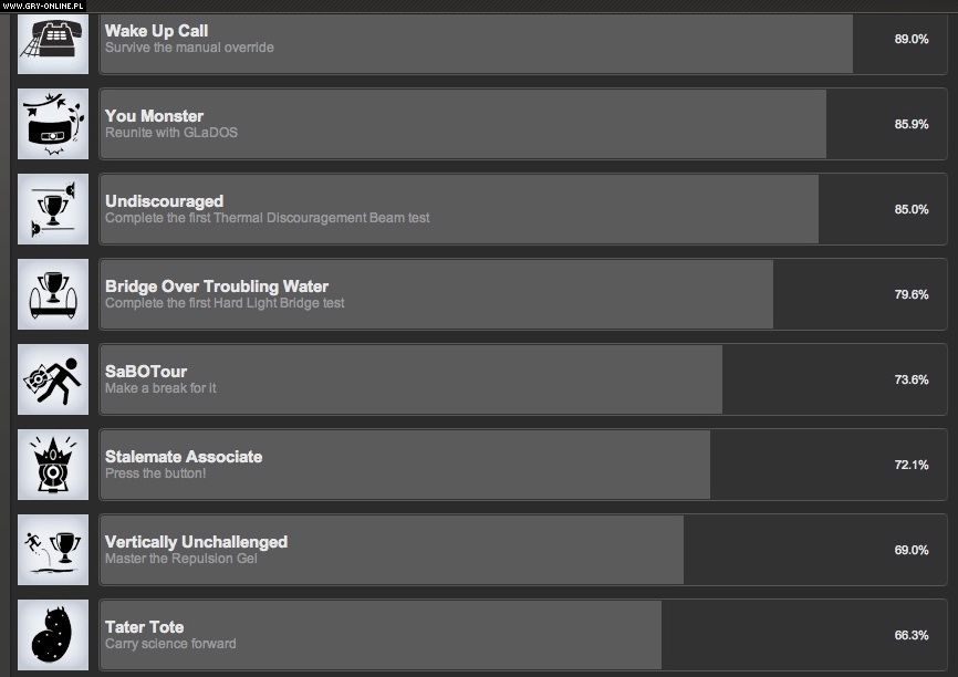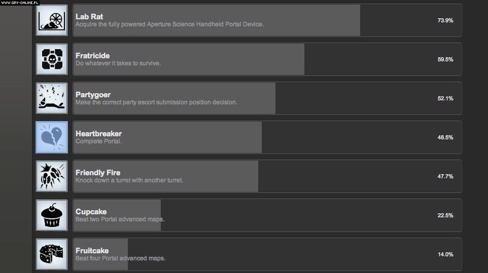 Wertując dane udostępnione przez serwis firmy Valve można też wyciągnąć kilka innych wniosków. Niewątpliwie jedną z najbardziej zaskakujących informacji jest to, że nieco ponad 10% graczy nie zdobyło pierwszego osiągnięcia, nie wymagającego najmniejszego wysiłku. Można jednak przypuszczać, że są to osoby, które kupiły Portal 2, jednak rozgrywkę odkładają na bliżej nieokreśloną przyszłość.