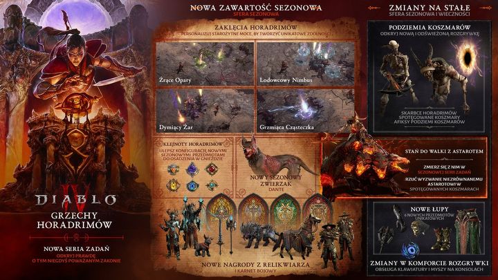 Dalej infografika wspomina już tylko przelotnie o zwierzaku sezonowym, łupach, przedmiotach kosmetycznych i „nowej, odświeżonej rozgrywce” – Podziemiach Koszmarów, które nie wydają się jednak wnosić nic szczególnego do całości Diablo 4. Wszystko to okraszono serią zmian w aspekcie komfortu rozgrywki – całości zdecydowanie brakuje polotu, a przede wszystkim ambicji.