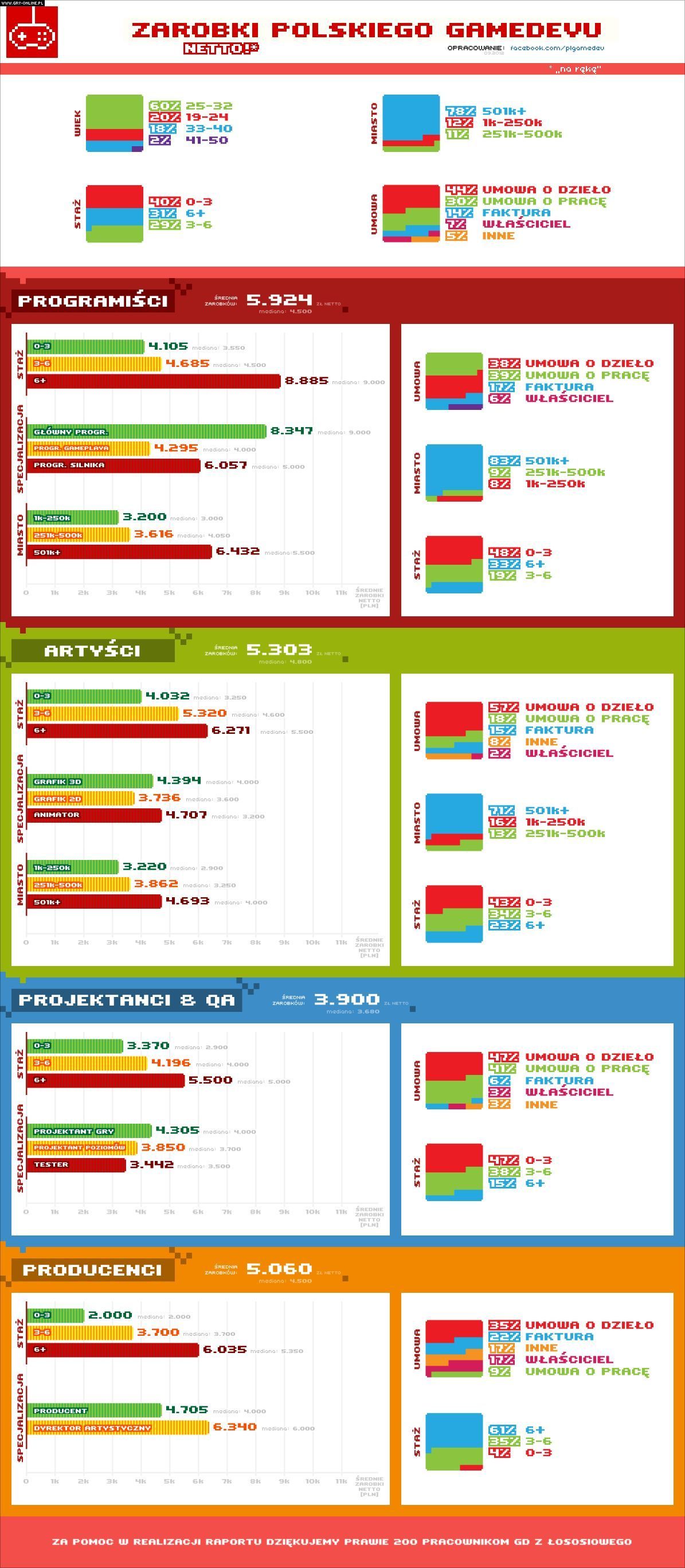 Po przeanalizowaniu wyników daje się zauważyć, że średnie zarobki netto w rodzimej branży tworzenia gier wynoszą od 2 tysięcy do ok. 9 tysięcy złotych. Wysokość stawek zależy nie tylko od zajmowanego stanowiska, ale także od konkretnej specjalizacji i długości stażu. Gołym okiem daje się zauważyć, że wśród ankietowanych najlepiej powodzi się programistom ze średnimi zarobkami w wysokości 5924 złotych. Jednak przy odpowiednio długim stażu (ponad 6 lat) i specjalizacji głównego programisty można dość znacznie przekroczyć kwotę 8000 złotych.