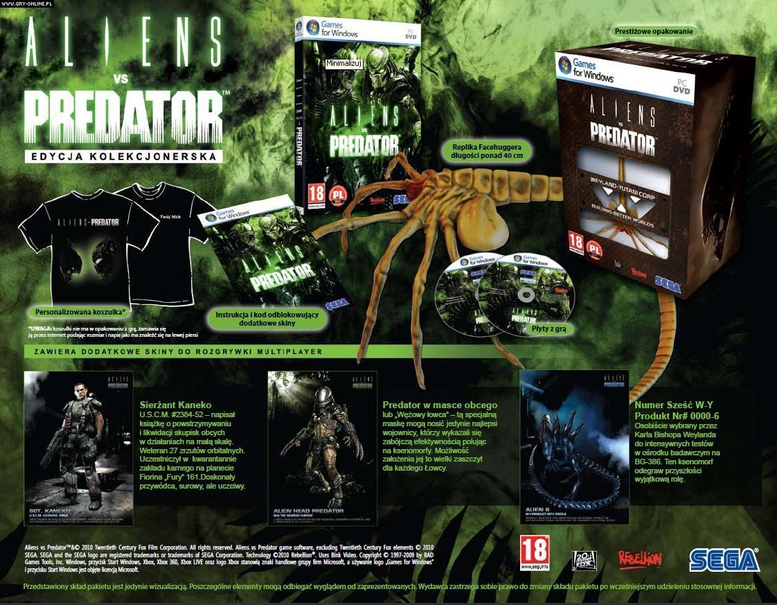 Poza koszulką w polskiej Edycji Kolekcjonerskiej znajdziemy również pozostałe elementy, które na świecie zawarte zostaną w Aliens vs Predator: Survivor Edition: stylowe pudełko z grą, instrukcję oraz kod odblokowujący dodatkowe skiny do trybu multiplayer (sierżanta Kaneko, predatora w masce obcego oraz xenomorpha Numer Sześć W-Y), replikę Twarzołapa o długości 40 cm oraz oczywiście dwie płyty z Aliens vs Predator. Za bonusowy zestaw przyjdzie nam zapłacić 199,90 zł (wersja PC). W kwestii wydania konsolowego dalej trwają negocjacje. Informuje o tym wpis na Twitterze jednego z pracowników CD Projekt.