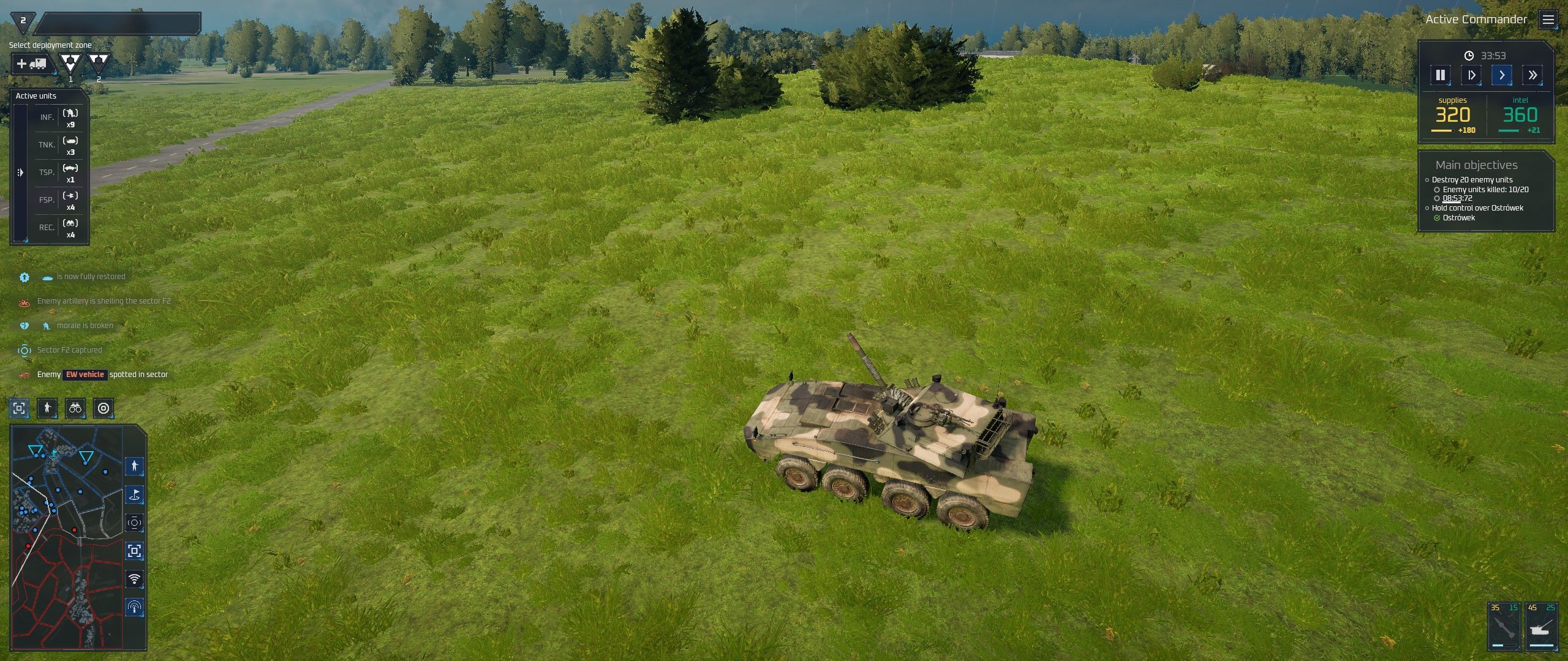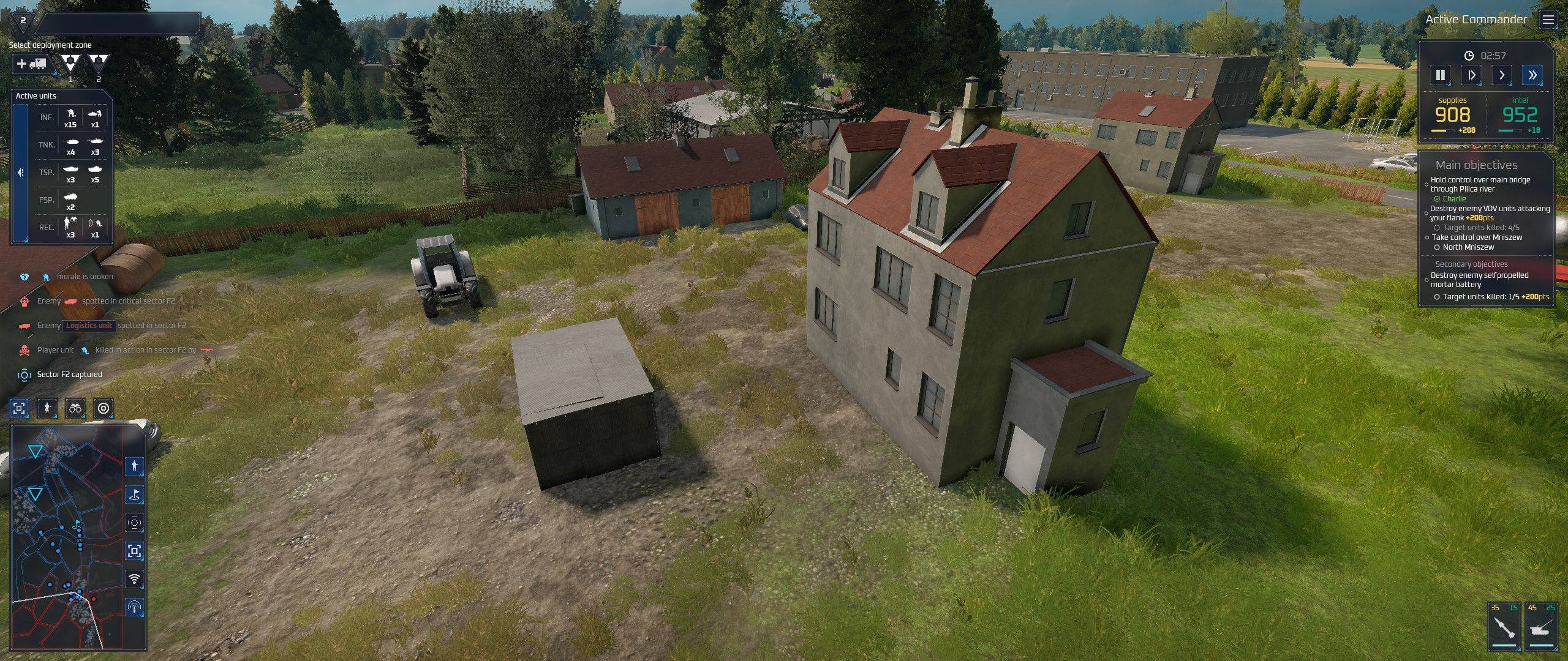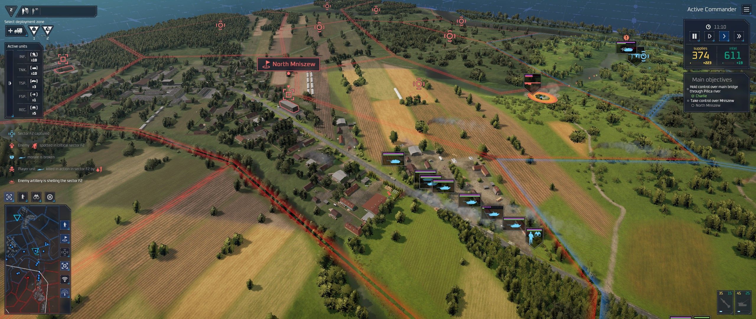 Skutkuje to tym, że w praktyce malujemy mapę taktyczną, przejmując zarówno istotne lokacje, jak i puste pola, które największe znaczenie taktyczne mają prawdopodobnie dla pasących się tam krów. Im więcej sektorów posiadamy, tym większy jest przychód punktów zaopatrzenia, za które kupujemy jednostki. Intel to kolejny zasób, pozwalający przyzywać lub usprawniać „ciężarówki-bazy”, który zdobywamy za wykrywanie jednostek wroga, zakłócanie jednostek walki elektronicznej, niszczenie zwiadu lub używanie dronów. Obszary w terenie zabudowanym mogą zajmować tylko jednostki piechoty, co zmusza gracza do przemyślanego tworzenia zgrupowań i w teorii uniemożliwia spamowanie wyłącznie wojskami pancernymi. Ostatecznie jednak i tak wygrałem bitwę dwa razy, tworząc gigantyczną pancerną masę.