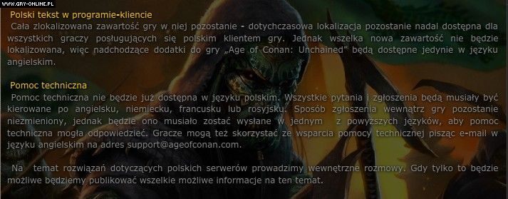 Jak możemy przeczytać w informacji, która pojawiła się w polskiej wersji klienta gry „(...) Zgodnie z podjętą decyzją nie będzie już polskiej usługi „Age of Conan”. Oznacza to, że nowa zawartość (np. przedmioty, zadania, czy pełne dodatki) nie będzie tłumaczona na język polski.” Czytamy dalej, że gracze z naszego kraju będą mogli korzystać z możliwości wykupienia Abonamentu Premium po polskiej cenie do końca 2011 roku. Później będą traktowani na równi z innymi mieszkańcami Unii Europejskiej.