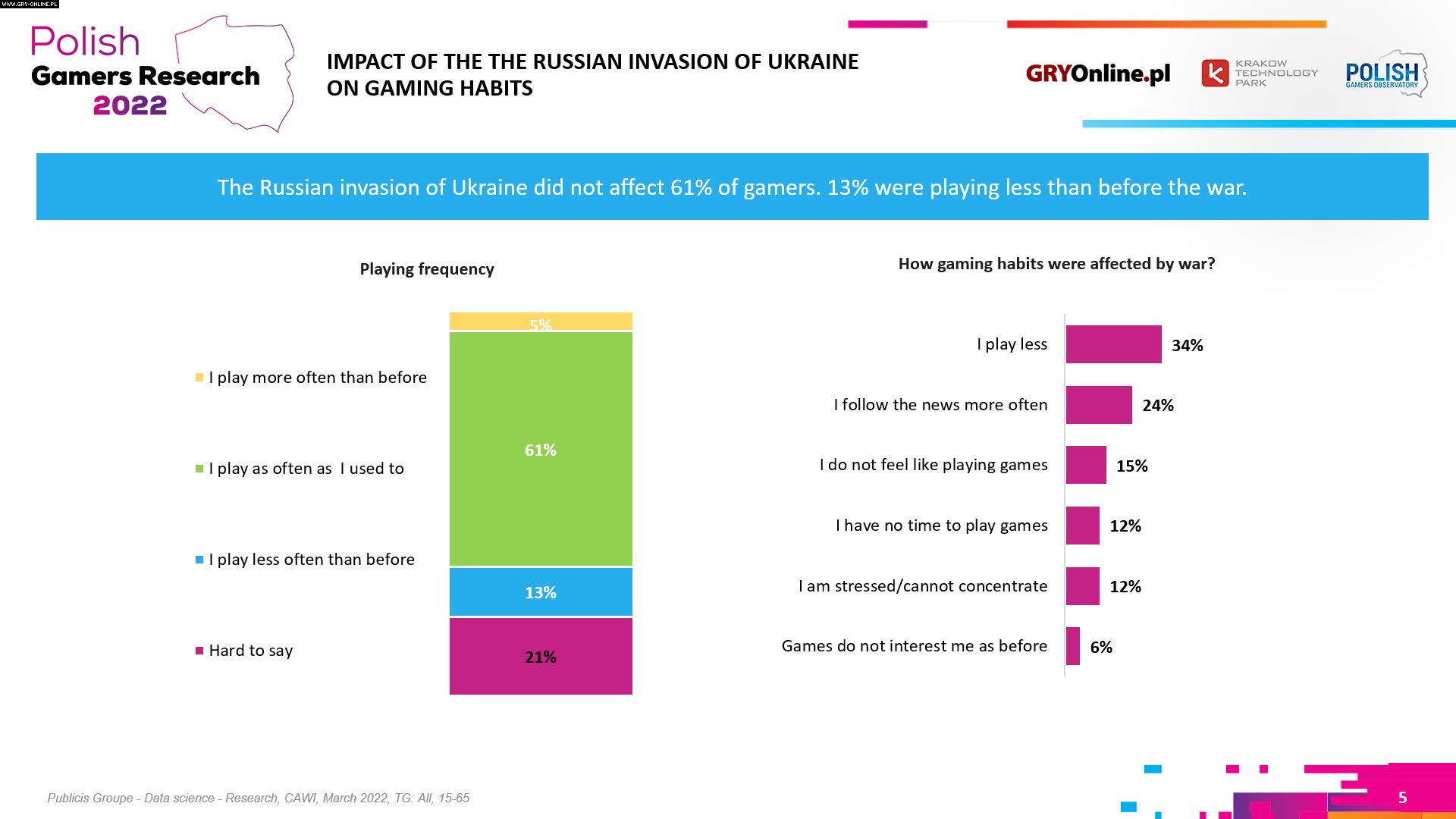 Spośród osób grających 13% wskazało wojnę w Ukrainie jako bezpośrednią przyczynę rzadszego oddawania się rozrywce przy grach wideo. Rosyjska inwazja sprawiła, że gracze częściej śledzą wiadomości, są bardziej zestresowani i często po prostu nie mają ochoty na spędzanie czasu w grze. Lub po prostu mają inne rzeczy na głowie.
