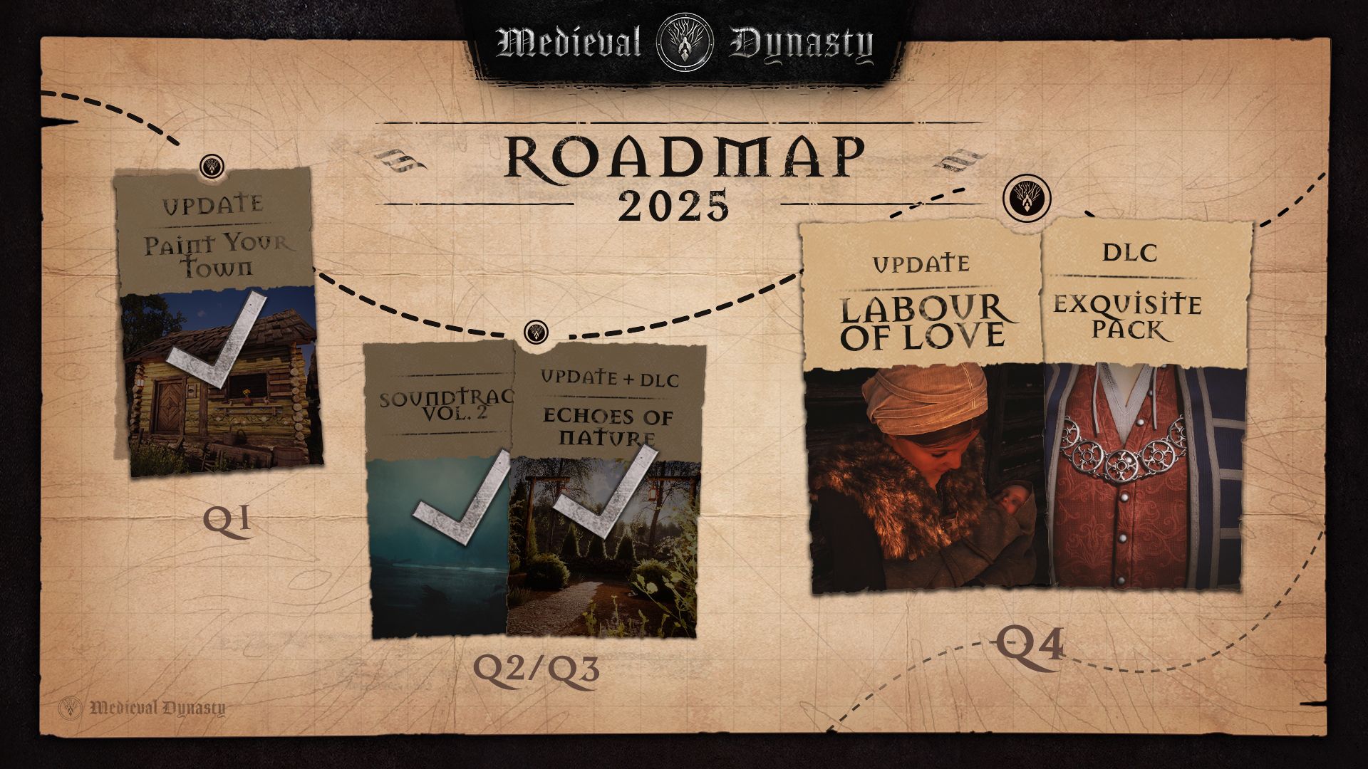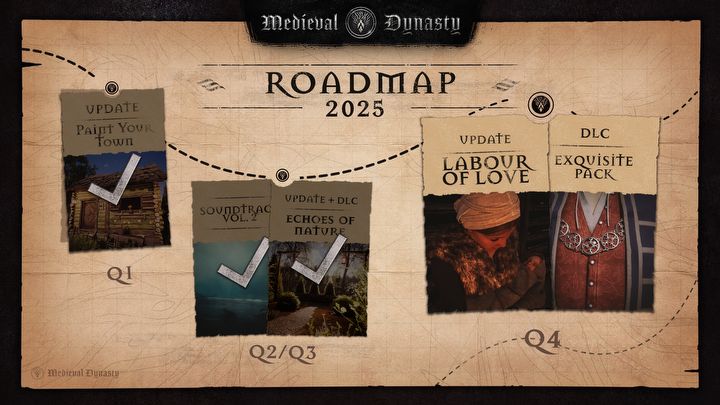 Studio Render Cube ogłosiło, że do końca 2025 roku Medieval Dynasty otrzyma jeszcze dwie porcje nowej zawartości – aktualizację Labour of Love oraz DLC Exquisite Pack. Mają one wprowadzić dodatkowe funkcje, usprawnienia i świeże treści do gry. Więcej szczegółów na temat tych elementów twórcy zamierzają ujawnić wkrótce.