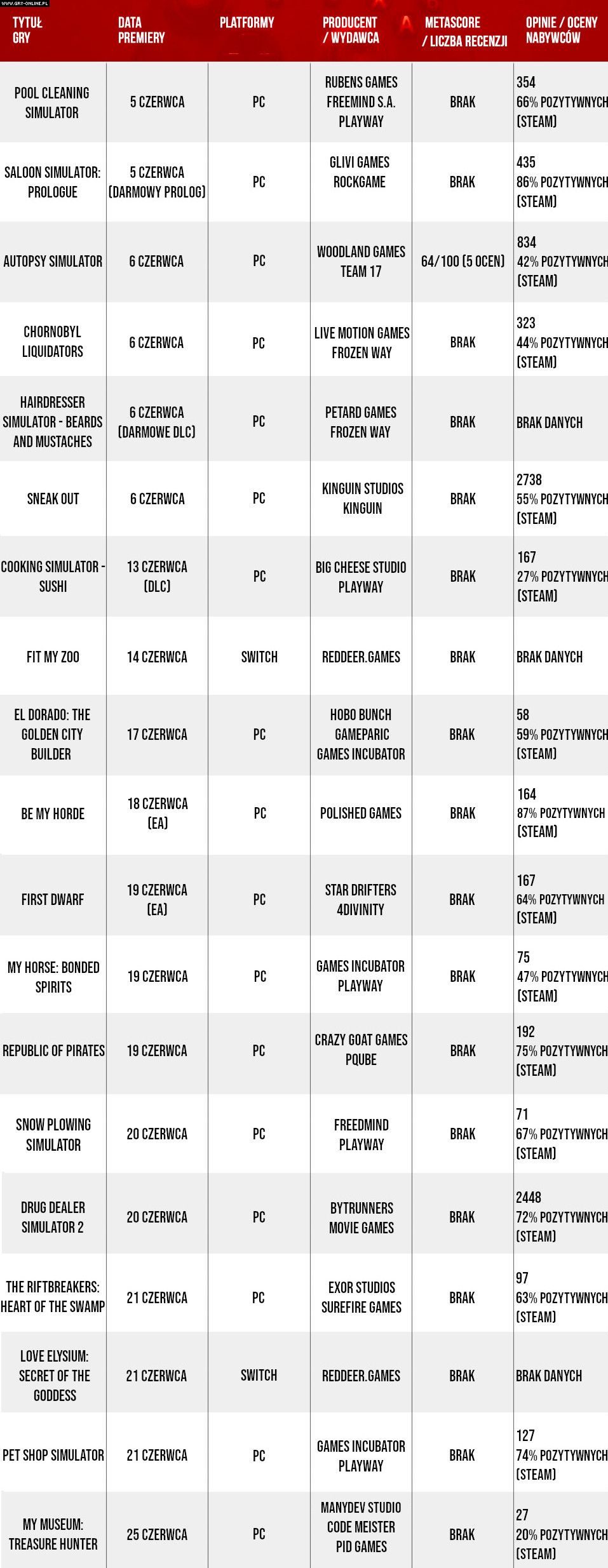 Wypadałoby mi też napomknąć o kilku pozycjach z maja, które jednak ukazały się pod koniec miesiąca. Nie żeby było specjalnie o czym pisać. Nawet Trans-Siberian Railway Simulator nie odnotował wybuchu popularności, ale przynajmniej nadal ma dobre opinie na Steamie i prawie dwukrotnie więcej ocen niż tuż po premierze. O pozostałych produkcjach z końcówki maja nie ma nawet co wspominać: w ich przypadku liczba recenzji i odbiór pozostały niezmienione.