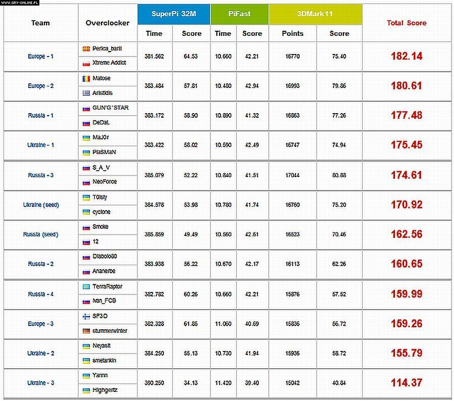 Uczestnicy byli oceniani według wyników osiąganych we wspomnianych benchmarkach, a także czasu poświęconego na podkręcenie obu podzespołów. Polsko-czarnogórski duet w składzie Xtreme Addict oraz Perica_Barli wygrał z rezultatem 182,14, wyprzedzając o 1,53 punkta rumuńsko-grecki zespół (Matose oraz Aristidis). Dokładne wyniki zawodów znajdziecie na zdjęciu na dole wiadomości.
