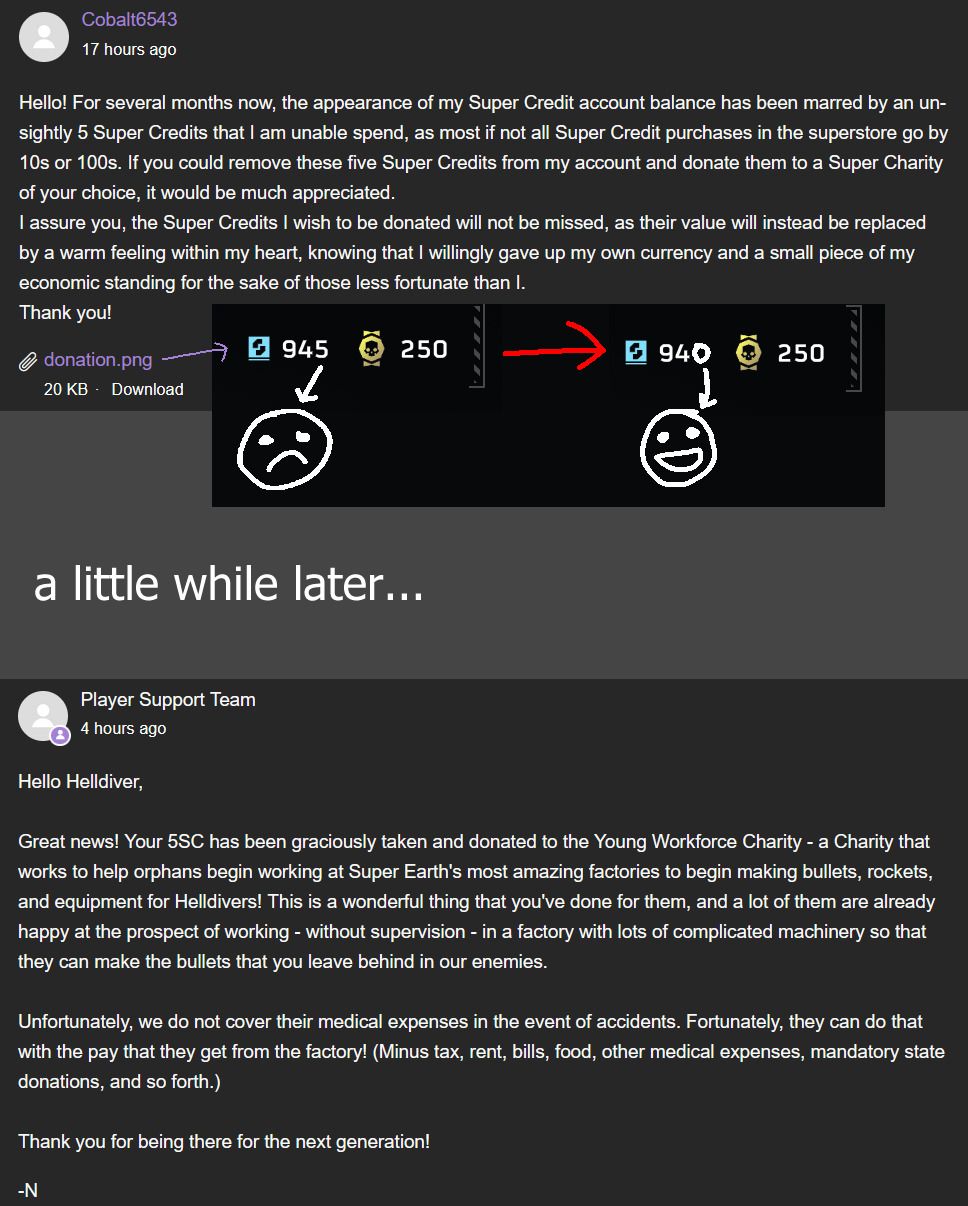 Kwota ta jednak irytowała go na tyle, że postanowił napisać do działu wsparcia gry i poprosić w zabawnej wiadomości o przekazanie tych denerwujących 5 kredytów na superziemskie organizacje charytatywne. Efektami podzielił się oczywiście z subredditem gry.