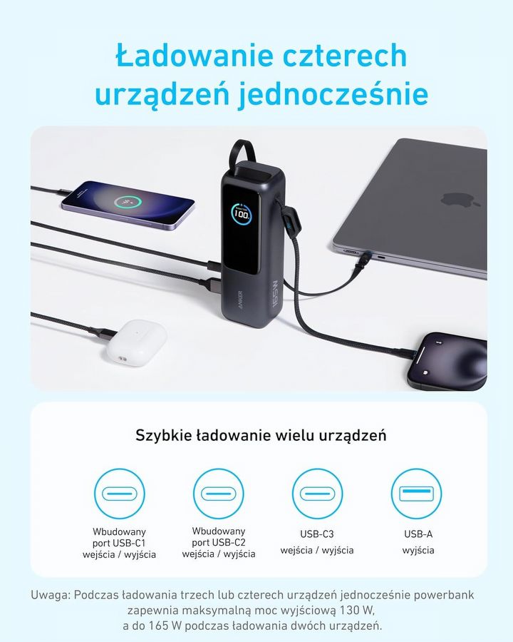 Na uwagę zasługuje również łączna moc ładowania wynosząca aż 165 W. Dzięki temu powerbank bez problemu poradzi sobie nie tylko ze smartfonami, ale także z bardziej wymagającymi urządzeniami – w tym tabletami czy nawet laptopami.