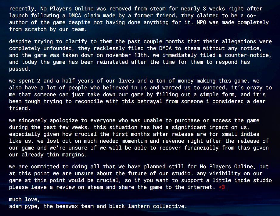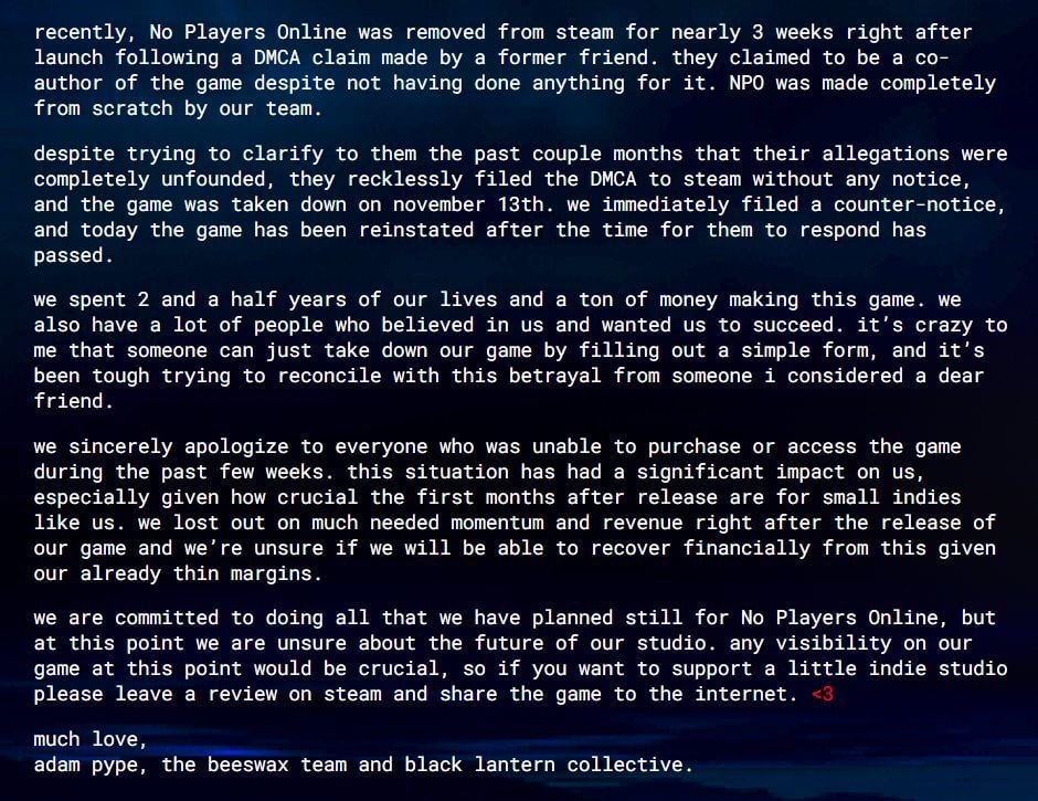 Niewielka produkcja mogła liczyć na zaangażowanych graczy, ale bez pomocy ze strony Steama jej premiera „została kompletnie zabita”. Mowa o nietypowym dziele No Players Online, którego tytuł okazał się proroczy – krótko po premierze nagle zniknęło ono ze sklepu Gabe’a Newella. Zaskoczeni użytkownicy długo musieli czekać na wyjaśnienia, tymczasem problem sprokurował jeden ze znajomych deweloperów, roszcząc sobie prawo do miana współtwórcy. Steam nie zareagował na argumenty studia Beeswax Games i na 3 tygodnie zablokował sprzedaż No Players Online.