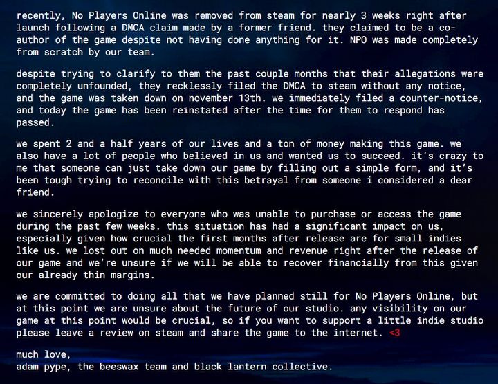 Produkcja zadebiutowała na platformie należącej do Valve 6 listopada tego roku, jednak zniknęła z oferty sklepu już siedem dni później. Według udostępnionego dzisiaj oficjalnego oświadczenia twórców, by do tego doszło, wystarczył jeden formularz z oskarżeniem o naruszenie praw autorskich (DMCA), w dodatku wypełniony przez osobę dotychczas uznawaną za przyjaciela zespołu. Studio bezskutecznie próbowało przekonać przedstawicieli Steama, że zgłoszenie jest bezpodstawne.