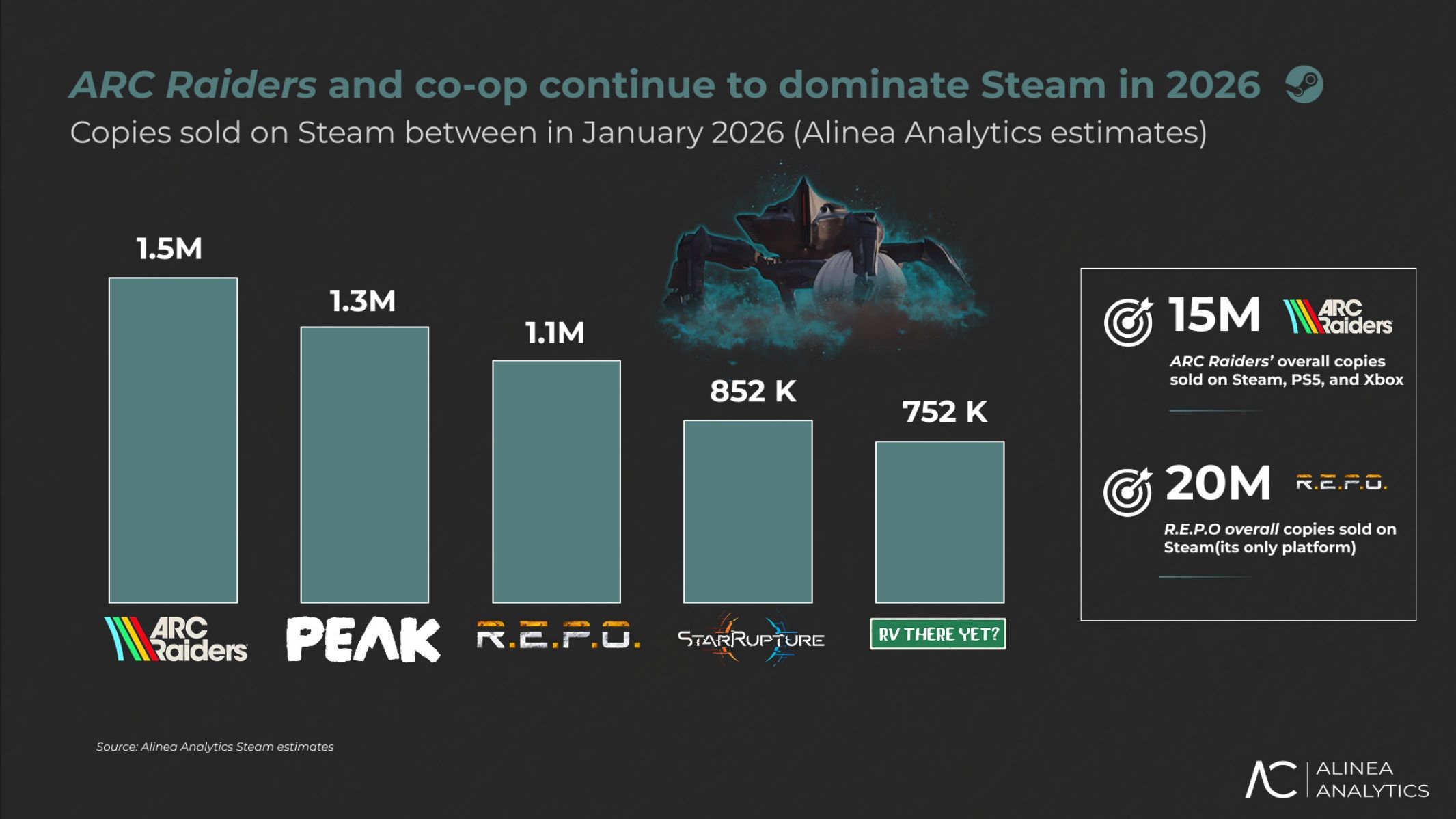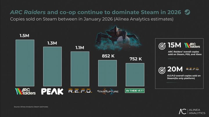 Według danych Alinea Analytics, ARC Raiders to obecnie jeden z największych hitów branży. Produkcja Embark Studios była najlepiej sprzedającą się grą na Steamie, PlayStation i Xboxie przez trzeci miesiąc z rzędu, a w samym styczniu 2026 roku sprzedała 1,5 mln kopii na Steamie oraz 1,7 mln egzemplarzy na konsolach. Łączna sprzedaż gry miała sięgać już około 15 mln kopii, generując – wedle szacunków – ponad 500 mln dolarów przychodu.