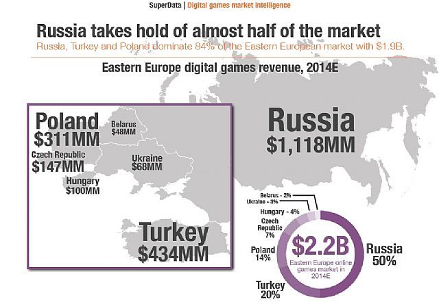 Jak się okazuje, łączny przychód z dystrybucji cyfrowej gier wideo w Europie Wschodniej wyniósł w ostatnim roku (do kwietnia 2014 roku) około 2,2 miliardy dolarów (o 7% więcej niż przed rokiem), z czego ponad 1 miliard przypada na samą Rosję. Druga w kolejności jest Turcja, generująca 20% całej sumy, a zaraz za nią Polska z 14%, czyli kwotą wynoszącą 311 milionów dolarów.