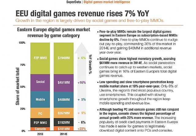 Europa Wschodnia powoli odchodzi od produkcji MMO opartych na modelu abonamentowym, choć w Rosji i Polsce trzymają się one lepiej niż w innych krajach. Segment ten wygenerował w ciągu ostatniego roku jakieś 205 milionów dolarów, przy czym w przyszłym roku przewiduje się spadek o 7%. Najlepiej radzą sobie gry free-to-play, osiągające łączny przychód w wysokości 800 mln dolarów. Zaraz za nimi uplasowały się szybko zdobywające na popularności gry społecznościowe (451 mln dolarów). W naszym kraju są one szczególnie popularne wśród kobiet – płeć piękna stanowi aż 64% Polaków grających w produkcje społecznościowe. Trzecią najlepiej zarabiającą kategorią są gry mobilne na systemy z rodziny Android (19% całego przychodu). Co ciekawe, eksperci upatrują szczególny potencjał rozwojowy tego segmentu w Polsce i Czechach, ze względu na „wysoki rozporządzalny dochód osobisty”. Co ciekawe, to właśnie Polacy średnio na gry mobilne wydają najwięcej, bo około 7,05 dolarów.