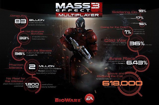 Studio BioWare ujawniło statystyki dotyczące trybu multiplayer w grze Mass Effect 3. Danymi podzielono się za pośrednictwem widocznej w tej wiadomości grafiki.