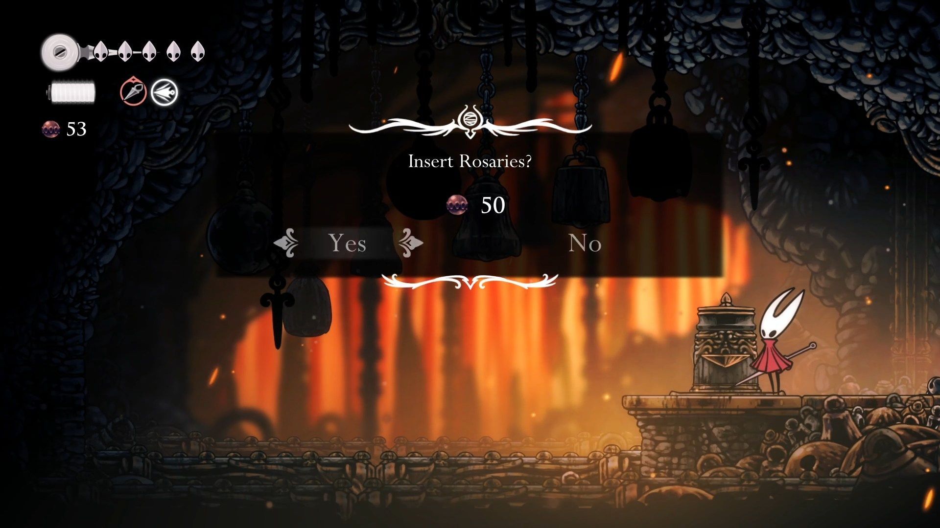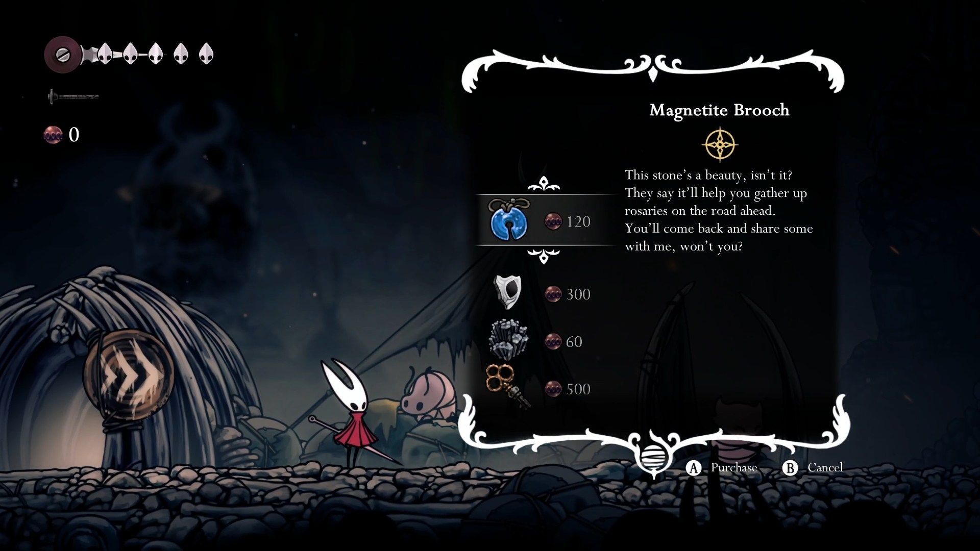Główną walutą gry są Rosaries, koraliki różańcowe. Silksong posiada system znany z soulslike’ów – jeśli zginiecie, stracicie wszystkie Rosaries. Możecie je odzyskać niszcząc kokon pozostawiony w miejscu waszej śmierci, lecz jeśli zginiecie ponownie przed jego odzyskaniem, stracicie je na dobre. Co jakiś czas warto zatem udać się na zakupy u jednego z wielu kupców by wydać Rosaries zanim je stracicie. Możecie również znajdować Rosary Strings, specjalne przedmioty, których zniszczenie natychmiast daje wam określoną ilość Rosaries. Warto wykorzystywać je podczas zakupów by móc zakupić interesujący was przedmiot. Możecie również kupować Rosary String od kupców by zabezpieczyć swoją walutę, lecz odradzamy to – kupno Rosary String kosztuje 80 Rosaries, lecz jego użycie daje wam tylko 60 Rosaries.