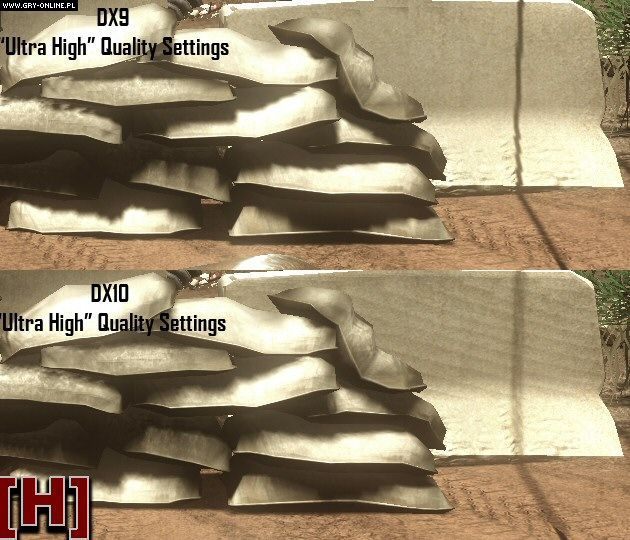 Na pierwszy ogień poszły cienie. Okazuje się, że głównym plusem i przewagą dziesiątej edycji DirectX jest lepsze wygładzanie ich krawędzi. Wyglądają one ładniej, chociaż jak zauważyli twórcy porównania, w pewnych sytuacjach pojawiły się pewne niedociągnięcia – na DX10 wyraźniej bowiem widać różnicę w jakości cieni znajdujących się blisko bohatera i daleko. Ta rozbieżność zaciera się w przypadku starszej technologii. Niezbyt ładnie zdaniem testerów wygląda również sytuacja pokazana na obrazku powyżej. Na DX10 cienie na cementowej powierzchni murka tworzą jak gdyby dziwne paski o różnym natężeniu światła.