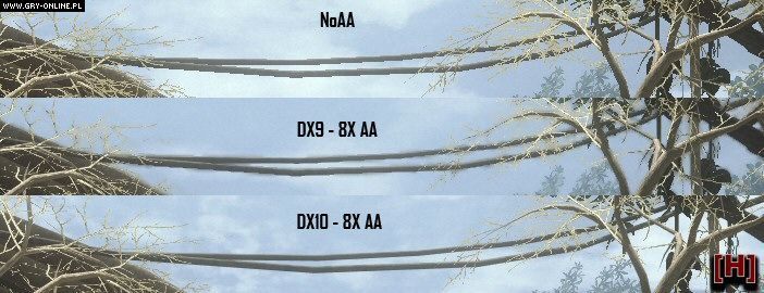 DX10 wygląda też podobno lepiej jeśli skupimy się na oświetleniu. Przede wszystkim, nowszy system domyślnie powoduje wyświetlanie nieco jaśniejszych i mocniejszych barw, co zdaniem autorów porównania prezentuje się lepiej. Wątpliwości nie ma w przypadku wygładzania krawędzi (czyli tak zwanego antialiasingu). Na tym polu DirectX 10 jest zdecydowanie lepszy. Szczególnie ładnie prezentuje się wygładzanie powierzchni przeźroczystych (ogrodzenie powyżej).