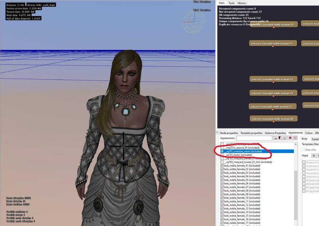 Użytkownik serwisu Reddit o pseudonimie InTheZ0n3 ujawnił, że w plikach edytora można natrafić na postacie nazwane po prostu ojciec i matka Vivienne, co sugeruje, że planowano ich udział w Krwi i winie. W ostatecznej wersji kluczową postacią zadania jest jednak jego zleceniodawca – zakochany w szlachciance rycerz Guillaume de Launfal.
