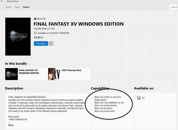 Tryb kooperacyjny Final Fantasy XV pozwoli posiadaczom Xboksa One i komputerów PC bawić się wspólnie. Źródłem informacji jest karta produktu w sklepie Windows Store.