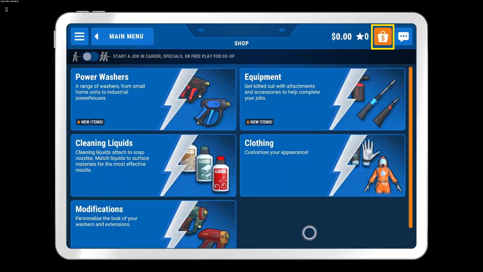 Łącznie panel ten posiada dwie zakładki w pierwszej z nich zmienicie wygląd myjki ciśnieniowej. W drugiej natomiast wybierzecie strój postaci.