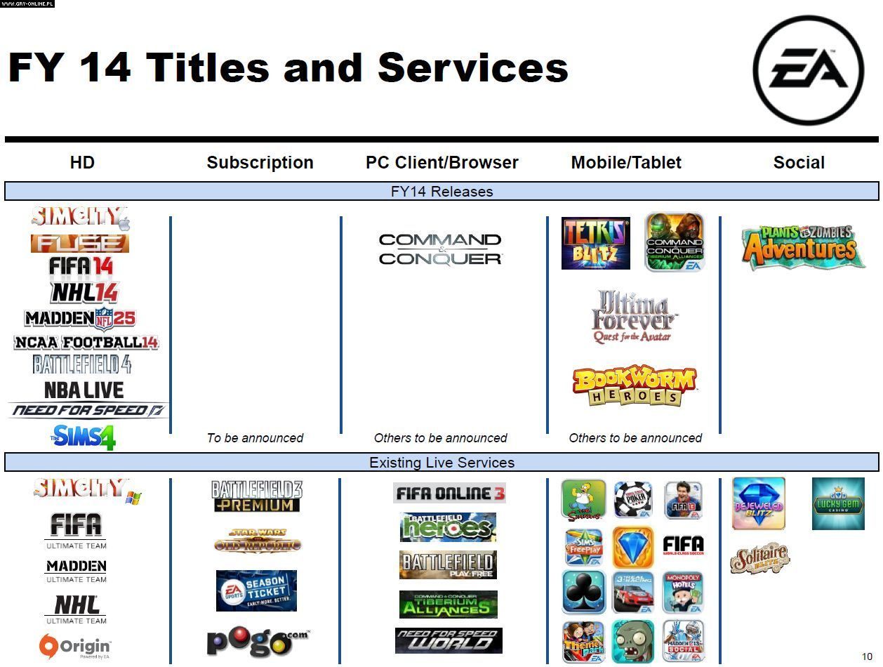 Firma Electronic Arts zapowiedziała, że w roku fiskalnym 2014 planuje wydać „11 dużych tytułów” na konsole i pecety oraz „15 gier mobilnych”. Wśród nich pojawią się przedstawiciele takich marek jak FIFA, NHL, Madden NFL, Battlefield, The Sims, czy Command & Conquer. Przy okazji ogłoszono, że na targach E3 doczekamy się również większej ilości szczegółów na temat gier od BioWare i EA DICE, a także demonstracji możliwości silników nowej generacji (Frostbite 3 i wspomniana technologia od EA Sports).