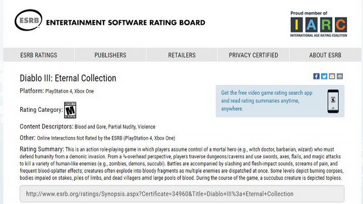 Dzięki amerykańskiej organizacji ratingowej ESRB dowiedzieliśmy się, że studio Blizzard planuje wypuścić na konsolach PlayStation 4 i Xbox One drugą edycję gry Diablo III - Diablo III: Eternal Collection.