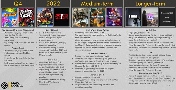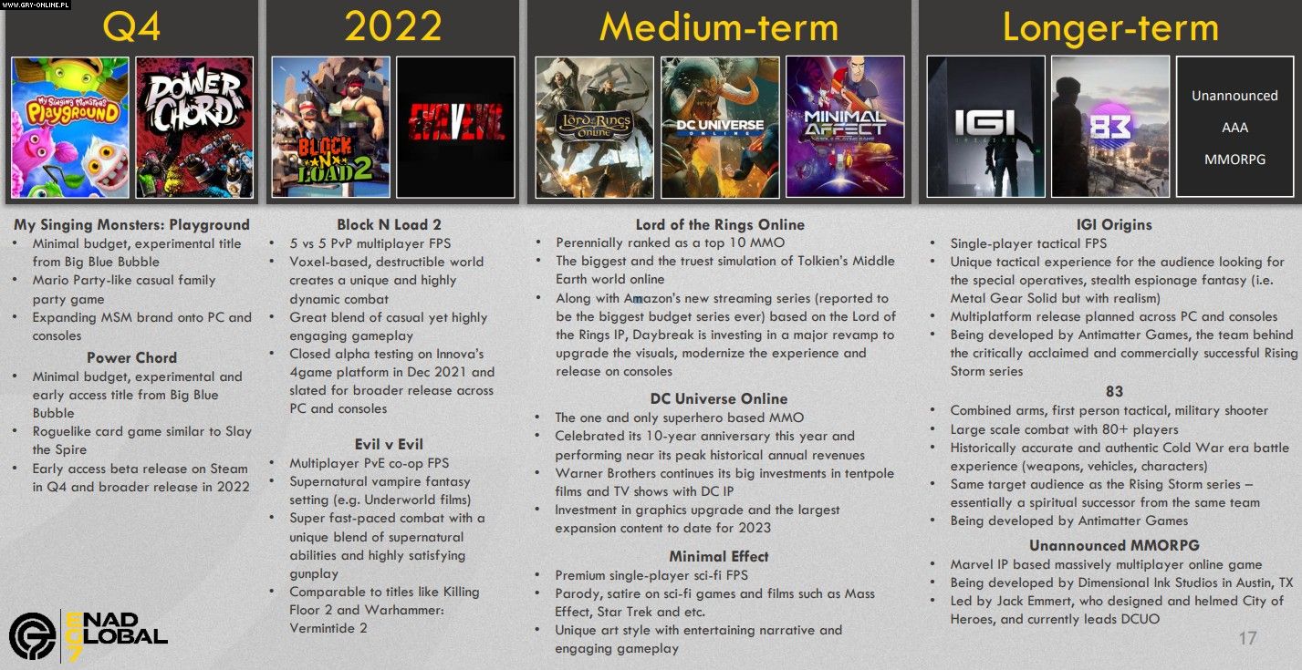 Prezentacja potwierdza również poprzednie doniesienia o dalszym losie gry The Lord of the Rings Online, która ma doczekać się ulepszonej warstwy graficznej, zapewnić graczom więcej ciekawych doświadczeń oraz pojawić się na konsolach PlayStation 5 i Xbox Series S/X. Celem odświeżenia pozycji jest przyciągnięcie osób zainteresowanych tworzoną przez firmę Amazon wysokobudżetową serialową adaptacją Władcy Pierścieni. Na ulepszenie oprawy wizualnej może także liczyć wspomniana wcześniej gra DC Universe Online.