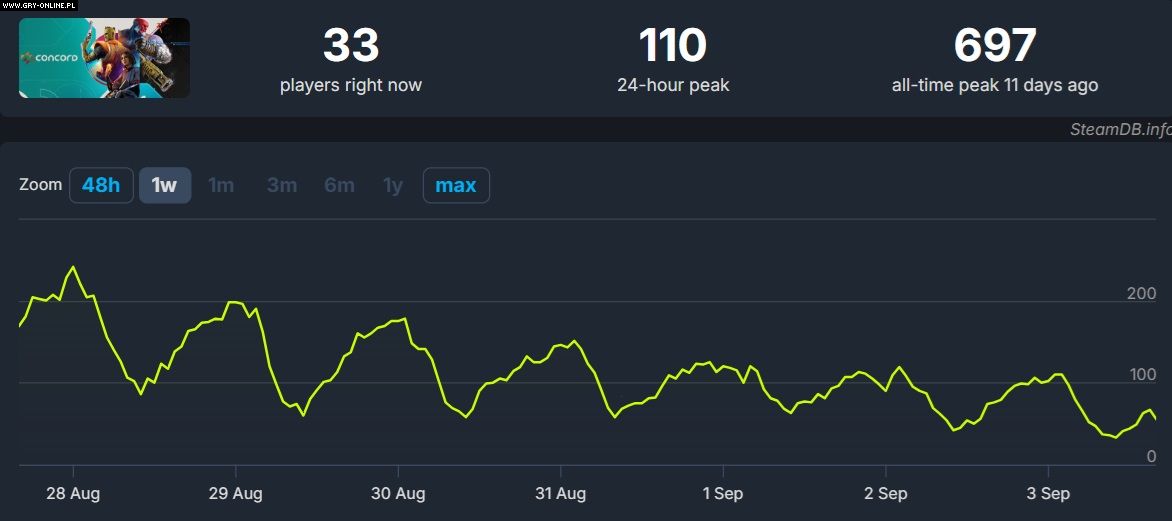 Można powiedzieć, że gracze trafnie przewidzieli porażkę omawianego sieciowego FPS-a. Przypomnijmy, że na platformie firmy Valve w Concord jednocześnie bawiło się maksymalnie 697 użytkowników.