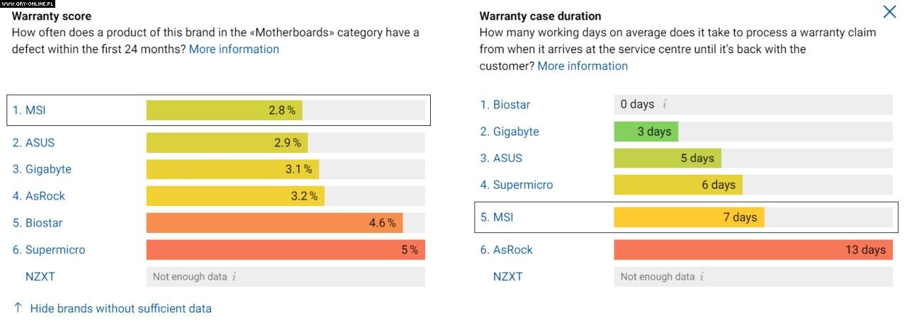 Tutaj dane są podobne w przypadku najpopularniejszych obecnie producentów, z MSi na pierwszym miejscu. Różnice są większe w przypadku oczekiwania na reklamowane urządzenie – prym wiedzie tutaj Biostar (natychmiastowa wymiana lub zwrot).