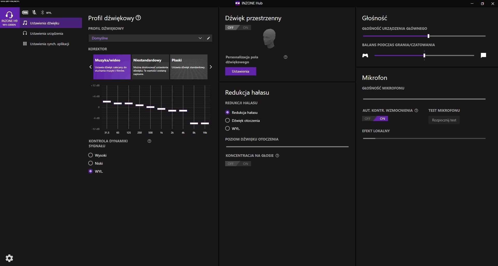 Oprogramowanie działa poprawnie i jest czytelne, choć zwłaszcza w modelu H5 nie oferuje zbyt wiele. Jednocześnie nie zauważyłem, żeby było zbyt zasobożerne, dzięki czemu bez problemu może działać w tle w trakcie korzystania ze słuchawek. W przypadku wyższych modeli, liczba dostępnych funkcji jest większa, a co za tym idzie częściej będziemy sięgać po INZONE Hub, by dostosować dźwięk do aktualnych potrzeb. Gdy mamy model H9, wówczas aplikacja poza standardowym korektorem i profilami dźwiękowymi da nam dostęp m.in. do ustawień ANC oraz dźwięku przestrzennego.