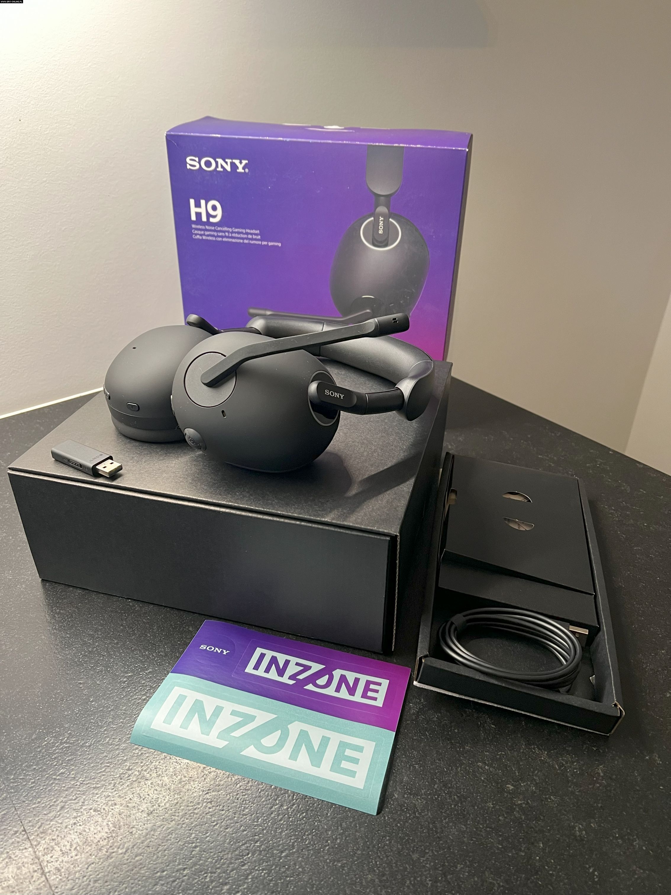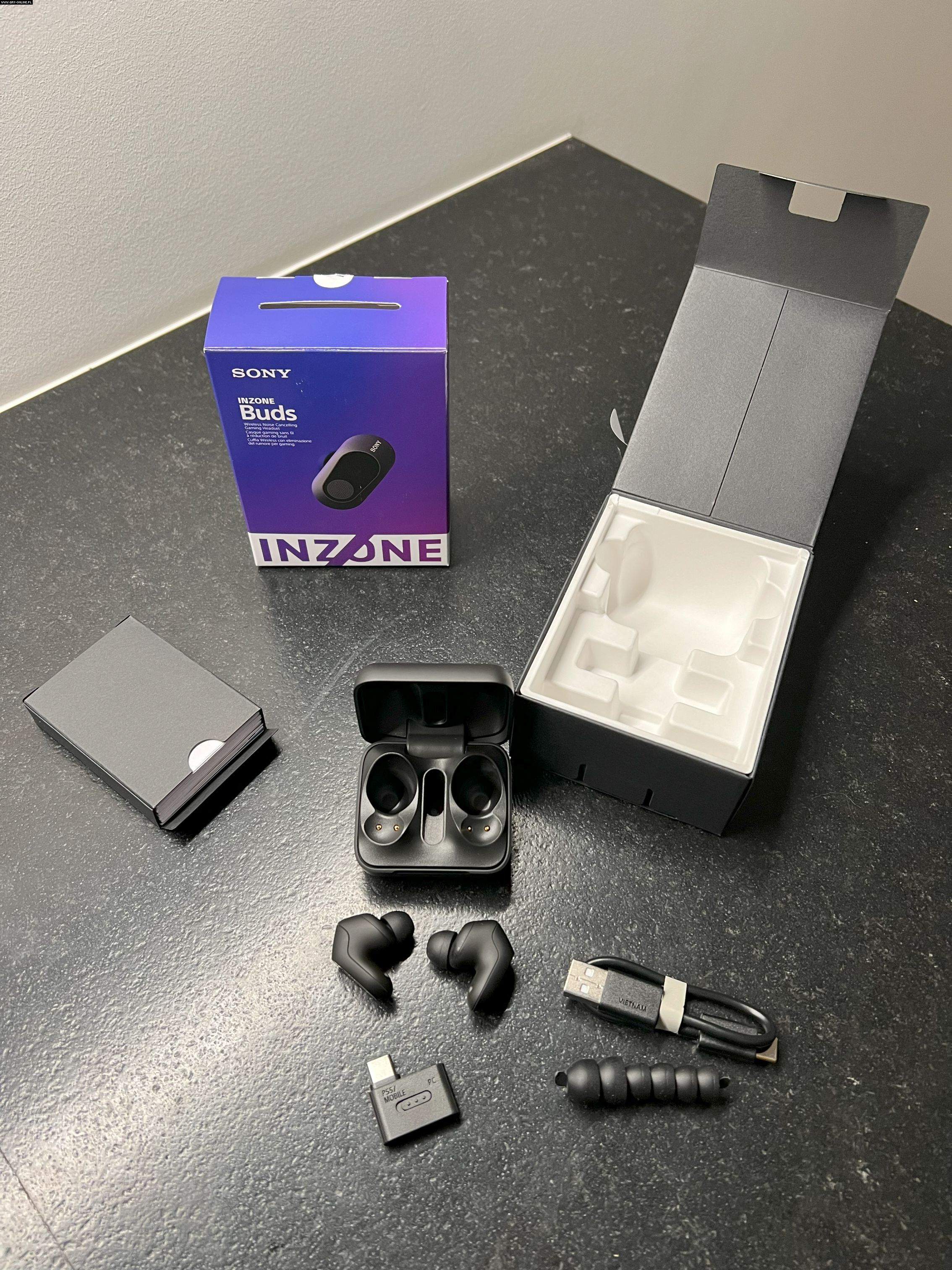 Zestaw Inzone Buds – zwróć uwagę na gigantyczny nadajnik, właściwie wyłączający możliwość korzystania z urządzeniami mobilnymi.Źródło: fotografia własna.
