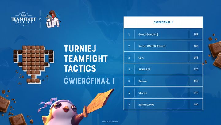 W zeszłym tygodniu odbyły się pierwsze ćwierćfinały turnieju Teamfight Tactics CUP by Wedel Up!. Tym samym poznaliśmy sześciu graczy, którzy awansowali już do dalszego etapu rozgrywek. Spotkania były bardzo wyrównane, a w ten weekend odbędą się kolejne, dzięki którym poznamy pełen skład półfinalistów.