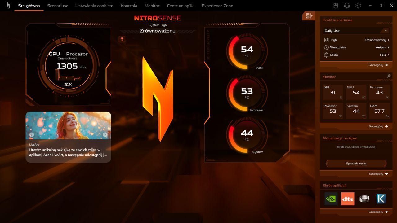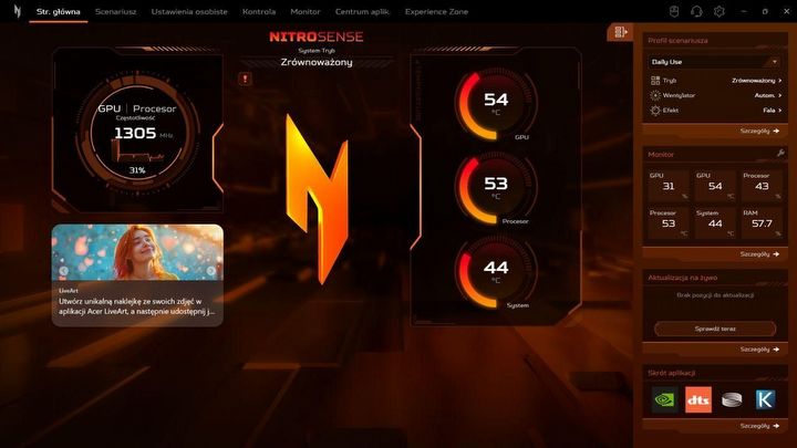Oprogramowanie to służy również jako panel personalizacji, dając pełną kontrolę nad podświetleniem klawiatury RGB, co pozwala dostosować estetykę stanowiska do nastroju gracza. Z poziomu NitroSense użytkownik zarządza także profilami dźwiękowymi DTS:X Ultra, optymalizując akustykę pod kątem konkretnych gatunków gier lub multimediów, co znacznie podnosi immersję. Dodatkowym atutem jest integracja z ustawieniami sieciowymi, umożliwiająca priorytetyzację ruchu dla grania i minimalizację opóźnień, zapewniając przewagę w rozgrywkach sieciowych.