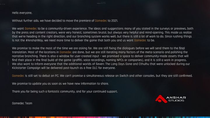 Jeszcze nie tak dawno cieszyliśmy się z informacji, że Cyberpunk 2077 pokrył się złotem i zadebiutuje zgodnie z planem. Niestety dzisiaj dowiedzieliśmy się, że inna polska produkcja utrzymana w klimatach cyberpunku zaliczy opóźnienie. Mowa tutaj o grze Gamedec, której twórcy ze studia Anshar za pośrednictwem Twittera przekazali wiadomość o tym, że dzieło zadebiutuje dopiero w 2021 roku (konkretnej daty nie podano). Powodem przesunięcia premiery jest krytyczny odbiór gry w ramach testów. Deweloperzy chcą mieć pewność, że Gamedec zostanie wydany w jak najlepszej formie, oraz zamierzają uniknąć pośpiechu. Oficjalną informację od twórców znajdziecie na poniższej grafice.