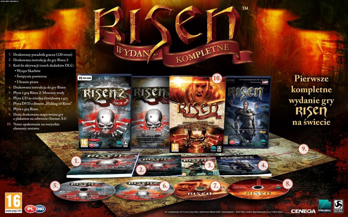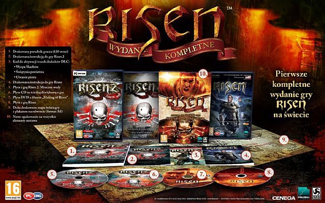 Cenega, partner firmy Deep Silver w Polsce, Czechach, Słowacji i na Węgrzech z przyjemnością informuje, że dziś do sklepów trafiła gra Risen: Wydanie kompletne. Ta bogata edycja zawiera gry Risen i Risen 2: Mroczne wody oraz wszystkie trzy dodatki DLC do Risen 2: Świątynię powietrza, Tajemniczą Wyspę i Ubranie pirata. Miło nam poinformować, że Polska jest pierwszym krajem na świecie, w którym dostępne jest wydanie kompletne gry Risen. Zawiera ono: