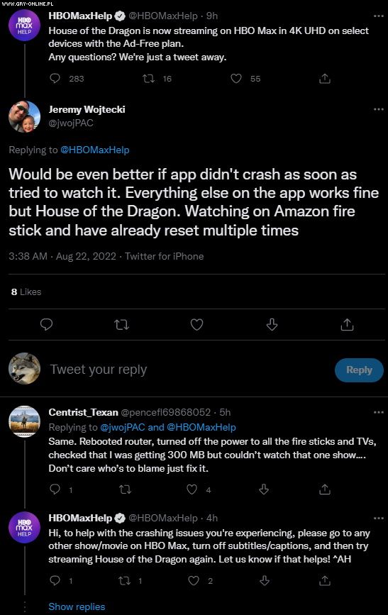 Co ciekawe, problem dotykał wyłącznie osób korzystających z HBO Max na urządzeniu Amazona, Fire TV. Według The Financial Express z tą awarią zetknęło się ponad 3000 osób. HBO radziło niektórym skarżącym się użytkownikom Twittera, aby próbowali restartować aplikację. Problemem mogą też być włączone napisy, dlatego kolejną radą na awarię jest wyłączenie ich w innym serialu/filmie na HBO Max. Awaria bowiem dotyczy wyłącznie Rodu smoka, posiadacze Fire TV nie mierzą się z nią, kiedy odtwarzają inne tytuły w aplikacji.