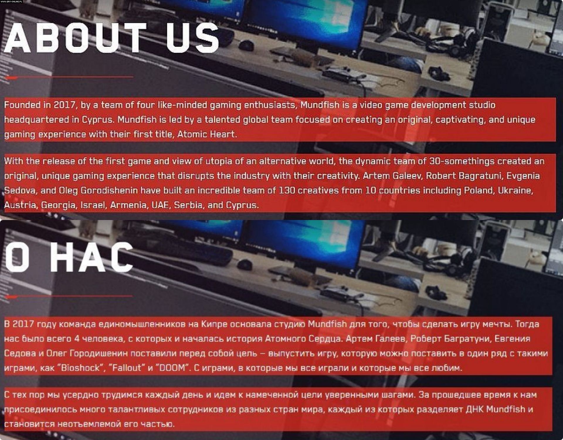 Czy 24 lutego był czarnym dniem w historii studia Mundfish? Nie znamy poglądów twórców Atomic Heart, nie wiemy, co sądzą o agresji ich kraju na słabszego sąsiada. Może, jak wielu Rosjan, ją popierają? A może wkurza ich ta wojna, bo przeszkadza w wydaniu nieźle zapowiadającej się gry? Może wreszcie uważają ją za to, czym jest faktycznie – za zło w czystej postaci? Nie wiemy tego, ponieważ studio Mundfish na kontrowersje związane ze zbliżającą się premierą odpowiedziało ogólnikowymi frazesami, ani słowem nie wspominając o tym, co dzieje się w Ukrainie. Co prawda określa się w przestrzeni internetowej jako międzynarodowy team, w skład którego wchodzą nawet Ukraińcy (takowych pracuje w firmie trzech). Szkoda jedynie, że podobnego komunikatu nie znajdziecie w zakładce „O nas” na rosyjskojęzycznej stronie firmy