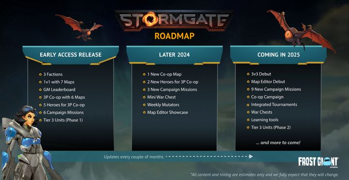 Stormgate pozostanie we wczesnym dostępie przez co najmniej rok. Do premiery wersji 1.0 tytuł wzbogaci się nie tylko o wspomniane misje fabularne, ale też o o nowe mapy i herosów, jednostki 3. poziomu oraz zaawansowany edytor. Pełną „mapę drogową” twórców na 2024 i 2025 rok zamieściliśmy poniżej.