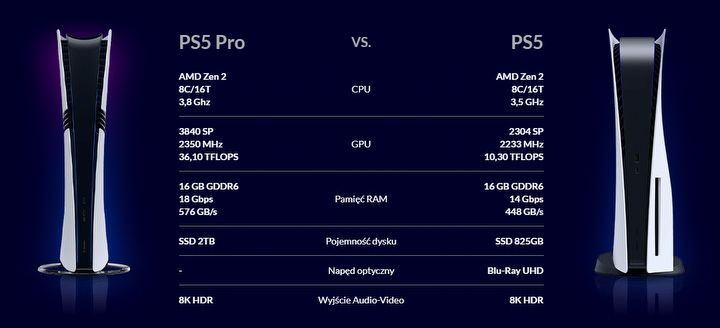 Warto przypomnieć, że już jakiś czas temu poznaliśmy cenę samej konsoli, która wynosić będzie 3499 zł dla wersji bez napędu. Poniżej natomiast możecie zobaczyć grafikę porównującą wersję Pro do zwykłego PS5.