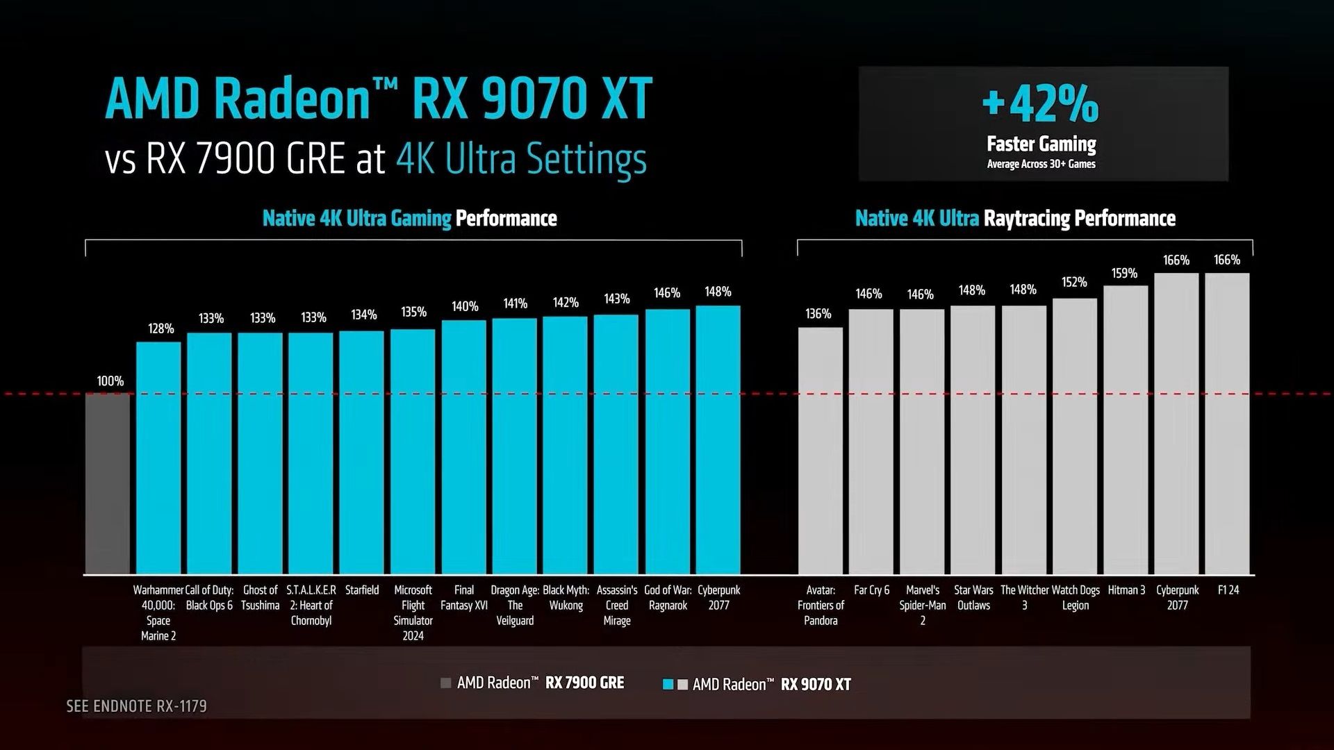 Udostępnione informacje jasno pokazują, że AMD postawiło w tej generacji na wzrost czystej wydajności. W 4K RX-y 9070 i 9070 XT oferują odpowiednio o 21% i 42% lepsze wyniki w grach w porównaniu do RX-a 7900 GRE. W przypadku rozdzielczości 1440p, wartości te spadają do 20% i 38%.
