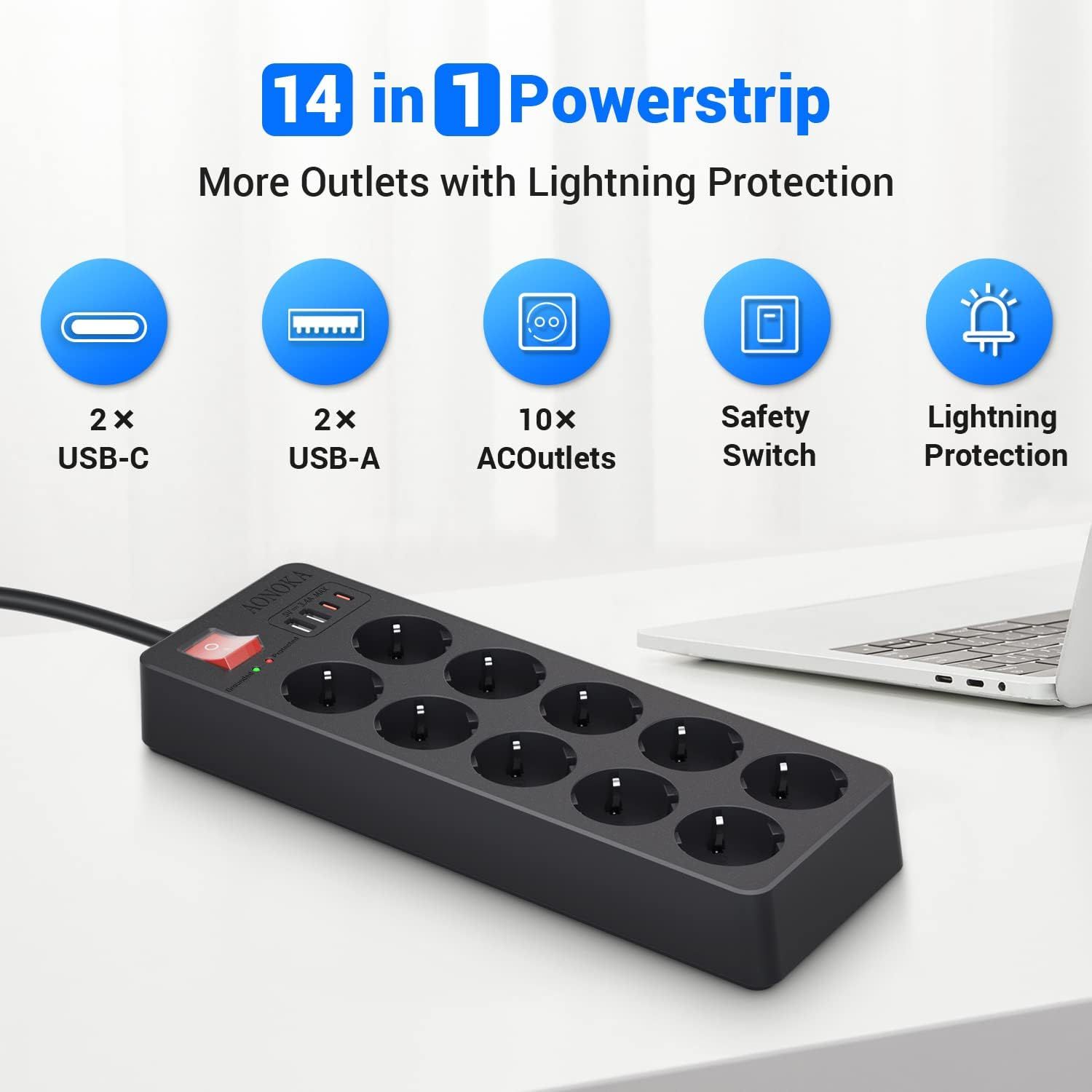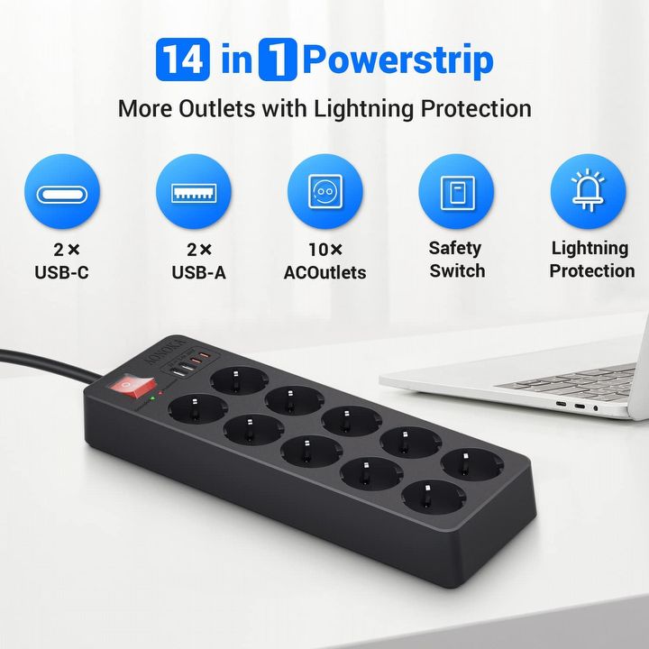 Praktyczna listwa zasilająca z wieloma gniazdkami i portami USB. Ułatwia organizację kabli, zapewnia wygodne ładowanie i chroni sprzęt przed przepięciami w domu lub biurze.