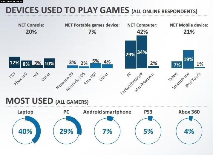 W październiku firma Ipsos MediaCT we współpracy z europejską federacją ISFE (Interactive Software Federation of Europe) przeprowadziła internetowe badania konsumenckie polskich graczy. Wynika z nich m.in. że Polacy najczęściej grają na laptopach, zazwyczaj w gry sieciowe, a co czwarty rodzic gra z własnymi dziećmi.
